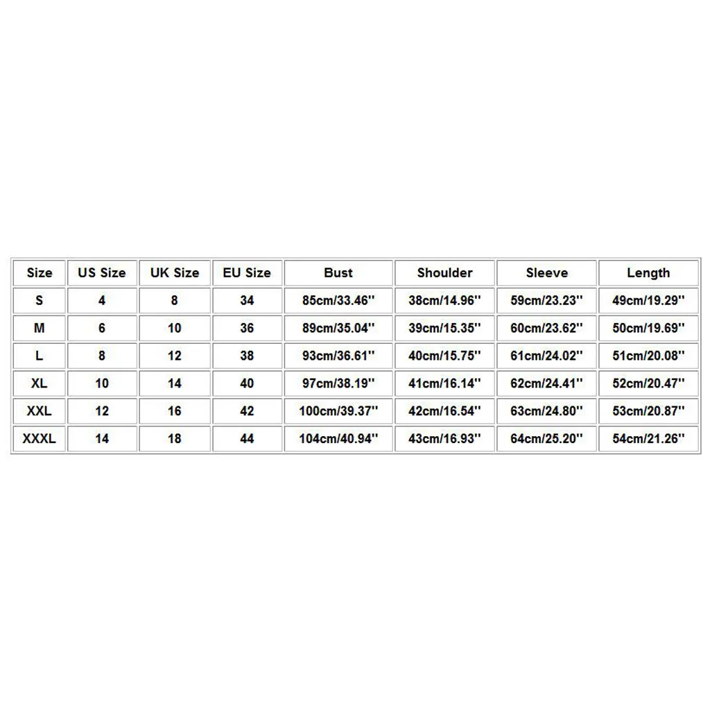 Пожалуйста, сравните размеры детали с вашими перед покупкой! Цвета могут немного отличаться в зависимости от настроек компьютера и монитора Пожалуйста, учитывайте разницу в 1-3 см из-за ручного измерения, спасибо (все измерения в см и обратите внимание, что 1 см = 0,39 дюйма) Размеры таблицей: Размер Нам Размеры UK Размеры ЕС Размеры Обхват груди Сумка на плечо Рукава Длина S 4 8 34 85 см/33,46'' 38 см/14,96'' 59 см/23,23'' 49 см/19,29'' М 6 10 36 89 см/35,04'' 39 см/15,35'' 60 см/23,62'' 50 см/19,69'' L 8 12 38 93 см/36,61'' 40 см/15,75'' 61 см/24,02'' 51 см/20,08'' XL 10 14 40 97 см/38,19'' 41 см/16,14'' 62 см/24,41'' 52 см/20,47'' XXL 12 16 42 100 см/39,37'' 42 см/16,54'' 63 см/24,80'' 53 см/20,87'' XХХL 14 18 44 104 см/40,94'' 43 см для ухода за ребенком для мам/16,93'' Высота голенища 64 см; 25,20'' 54 см/21,26''