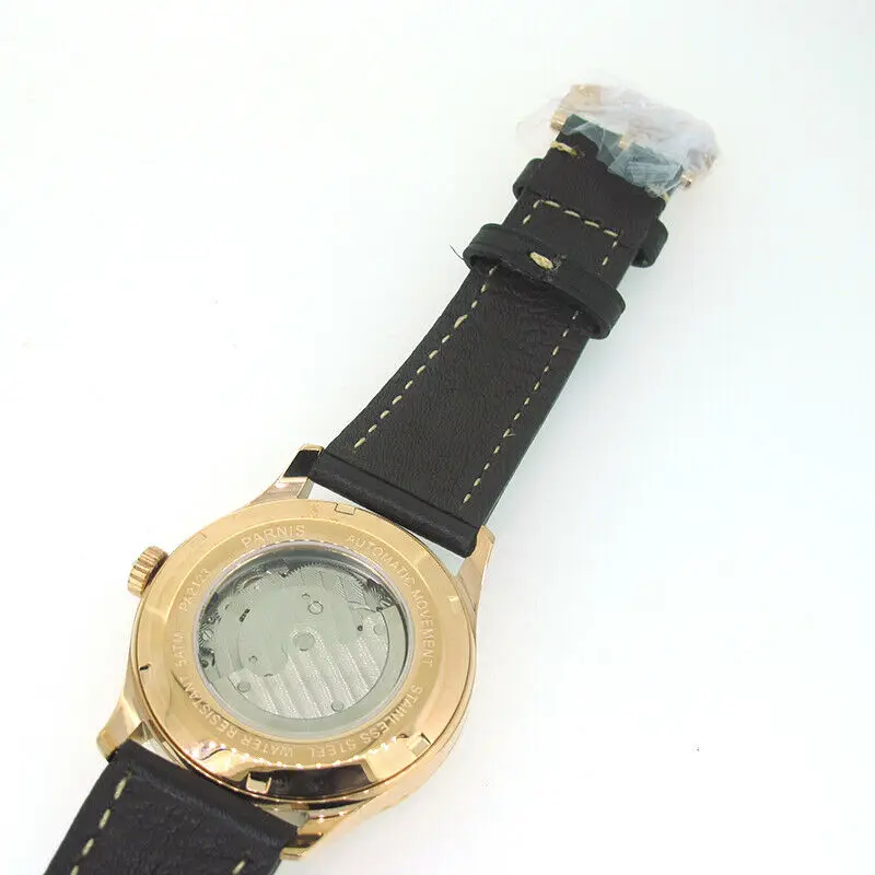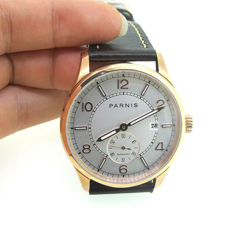 100% абсолютно новые и высококачественные мужские наручные часы Бренд: Парнис Размер: 41 мм (без короны) Механизм: Азиатский 1731 автоматический механизм Функции: час, минуты, маленькая секунда, дата Чехол: покрытый розовым золотом чехол из нержавеющей стали Кристалл: специальный устойчивый к царапинам минеральный кристалл Циферблат: часы с белым циферблатом Рамка: полированный ободок Ремешок: 22 мм кожаный ремешок Водонепроницаемость: 3 АТМ