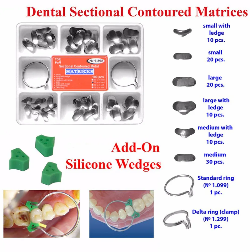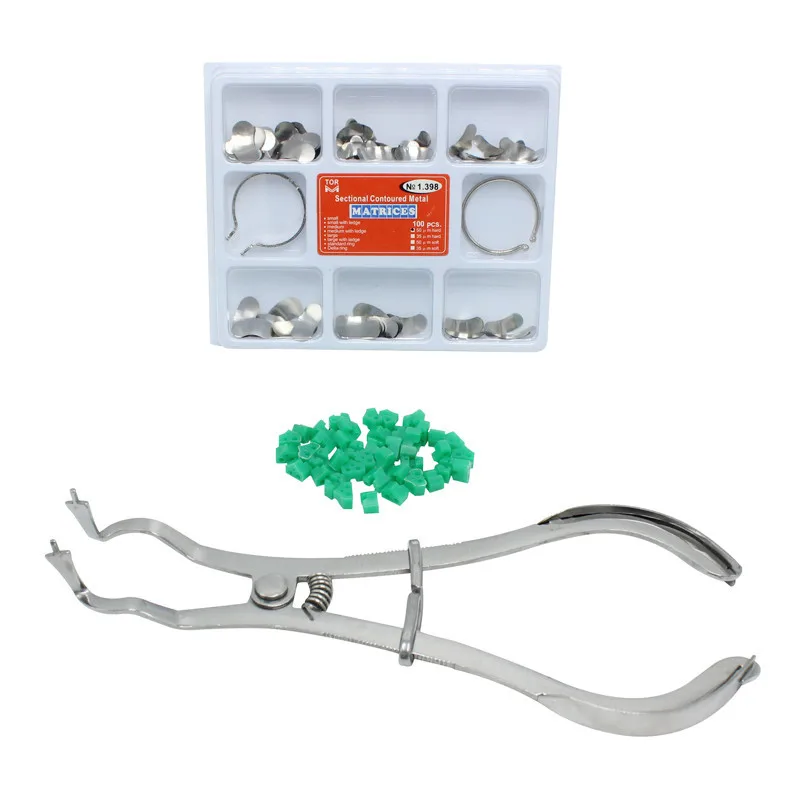 100 шт зубные матрицы секционные Контурные металлические матрицы No.1.398 + матрица группа формируя зажим + 40 шт клинья силиконовый Комплект Матриц
