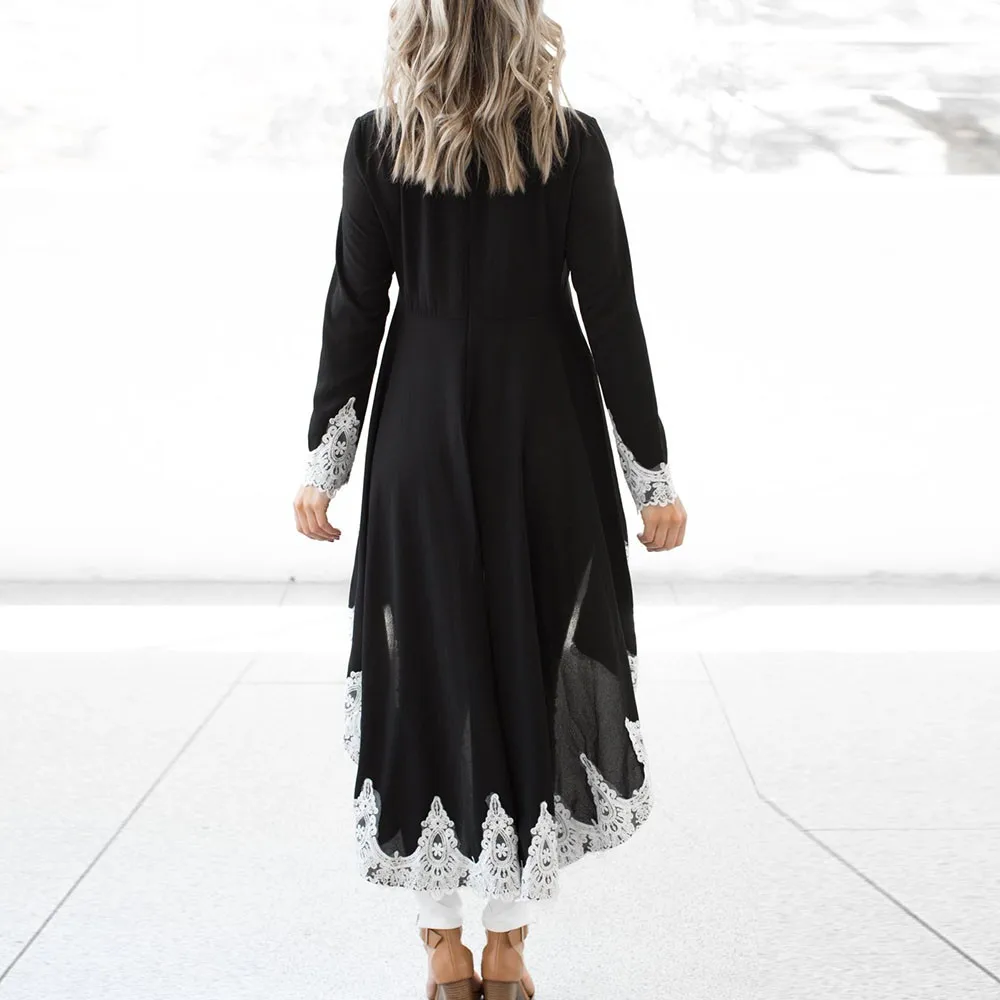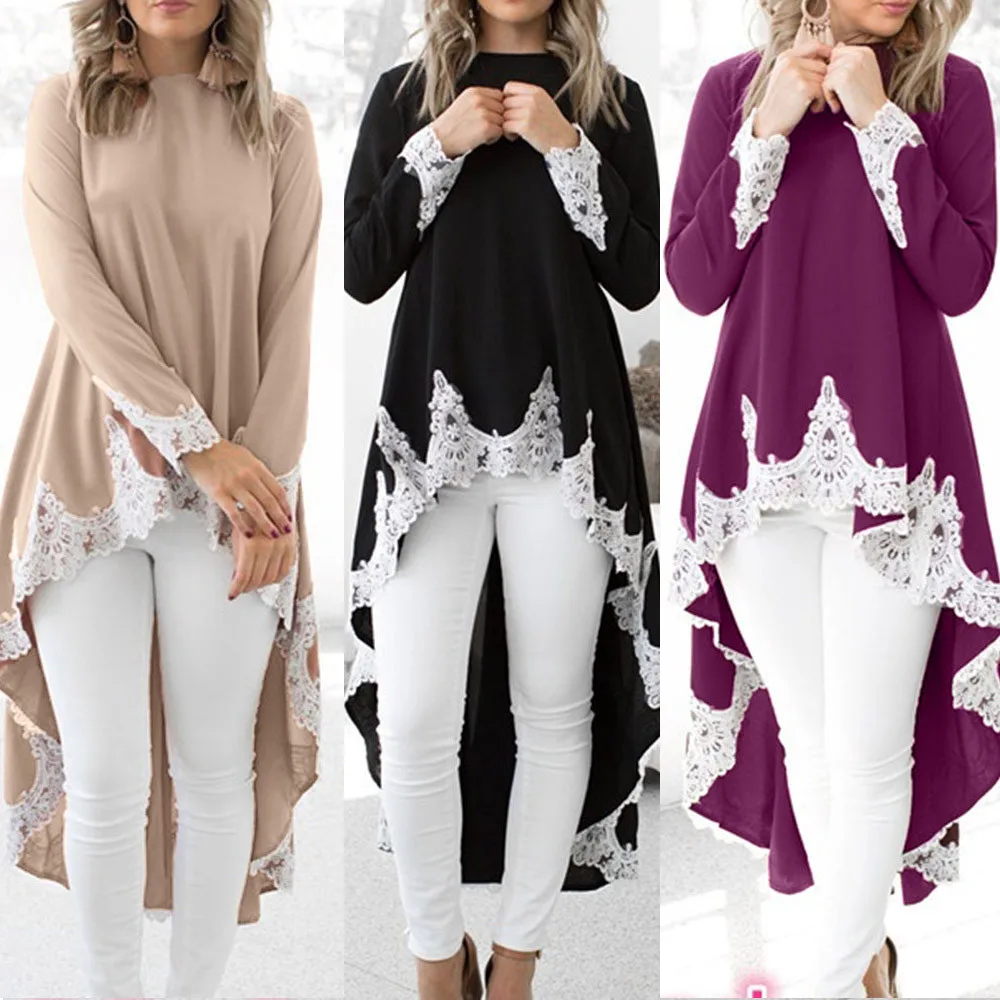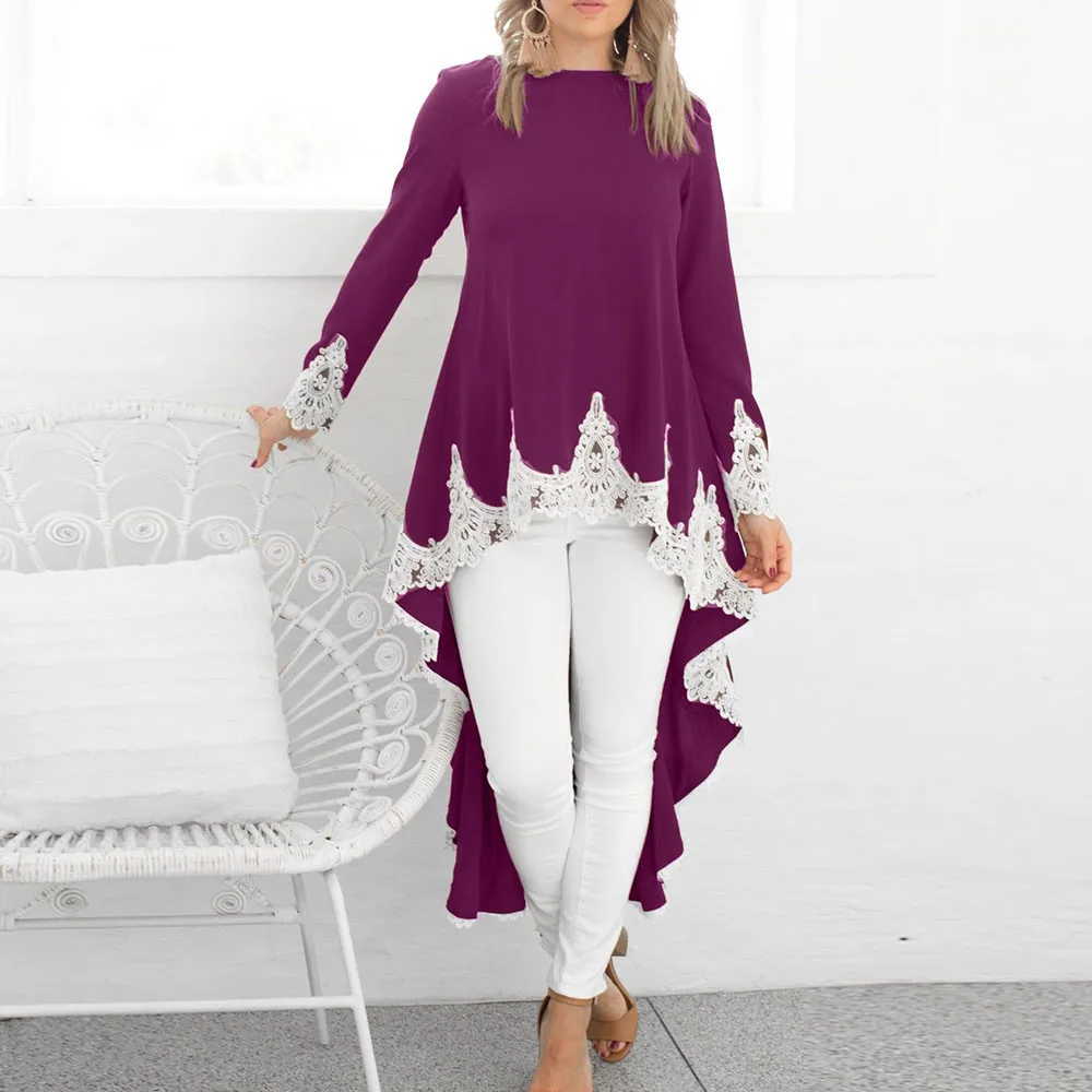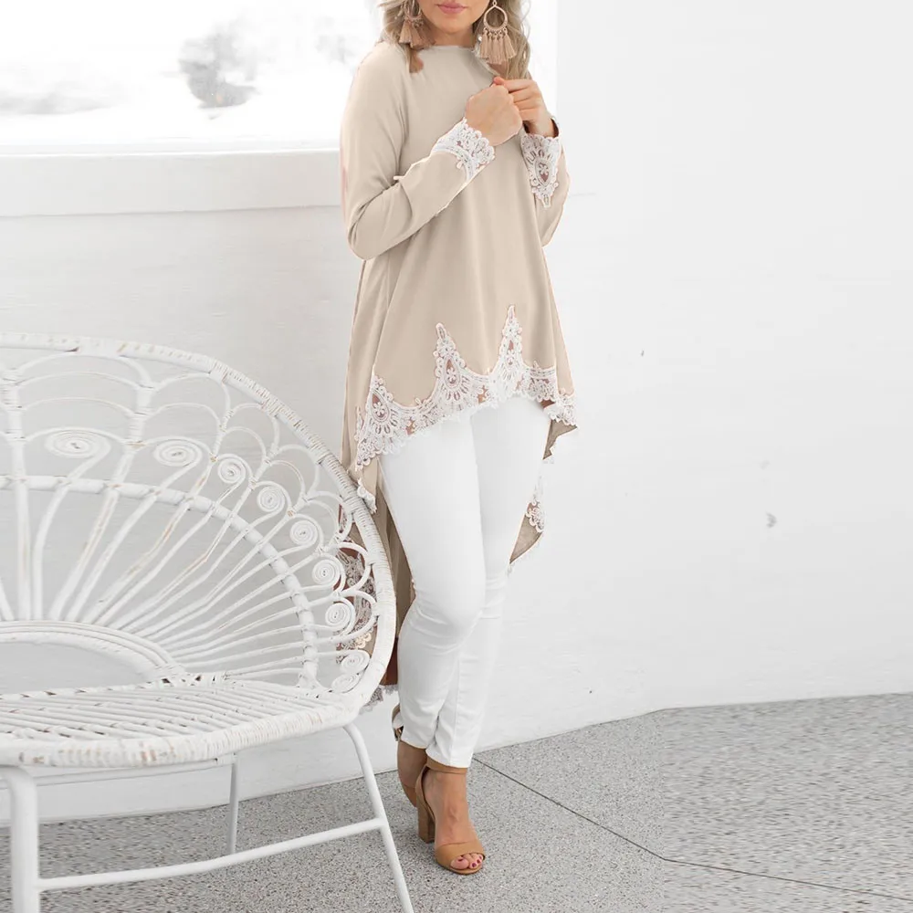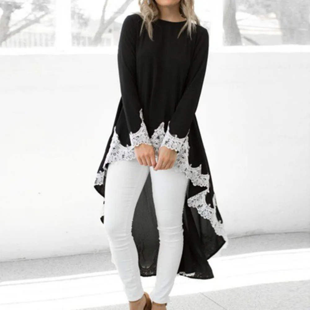Женский Повседневный пуловер с длинными рукавами и круглым вырезом, асимметричное однотонное кружевное платье