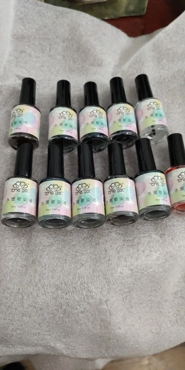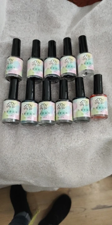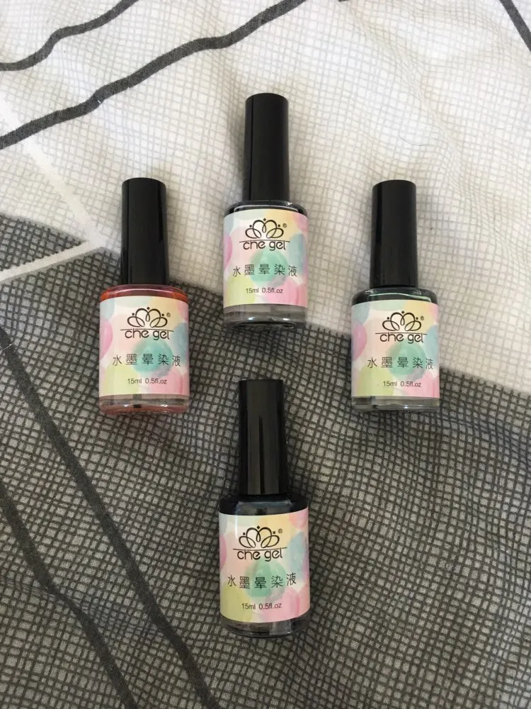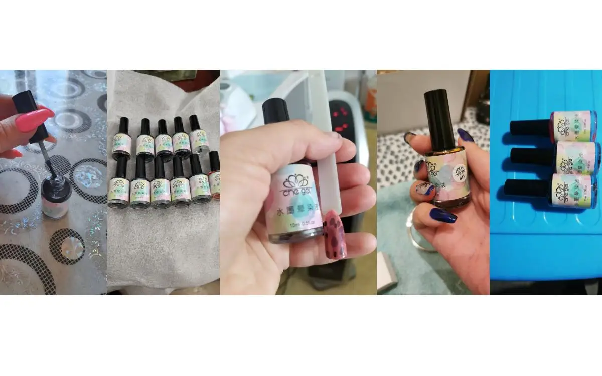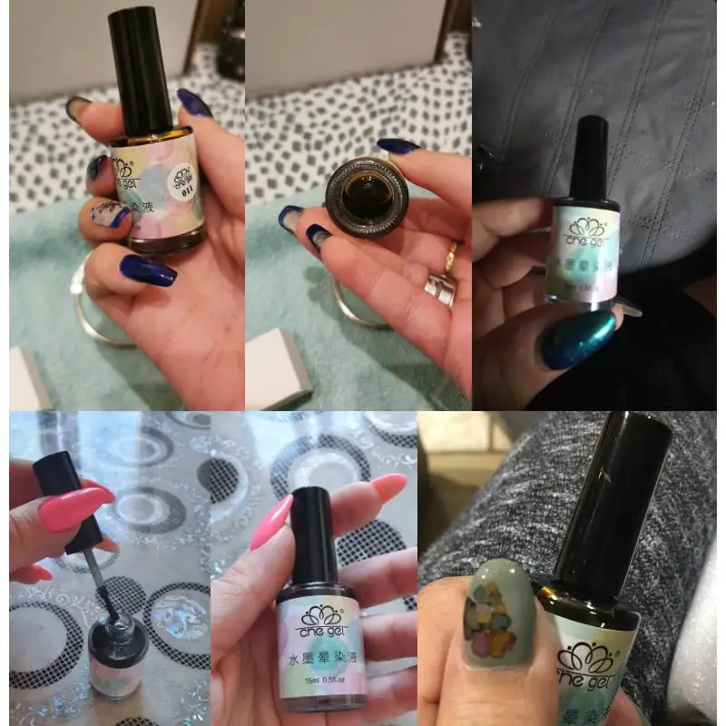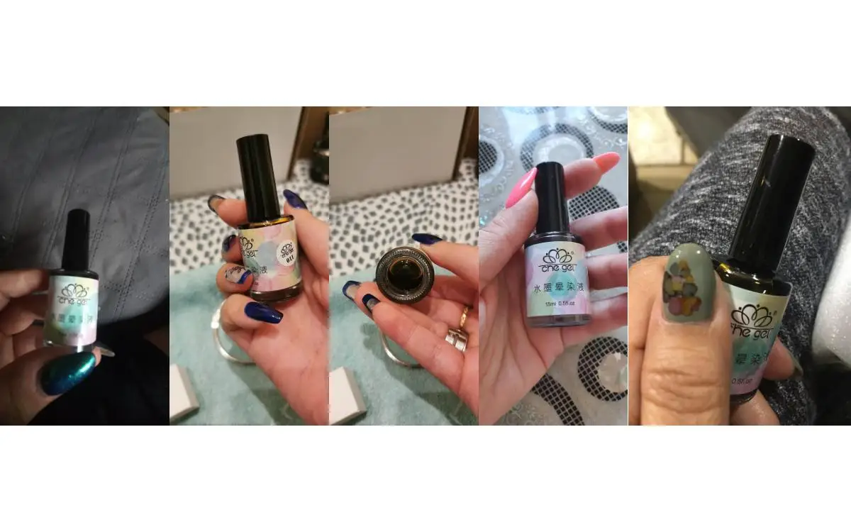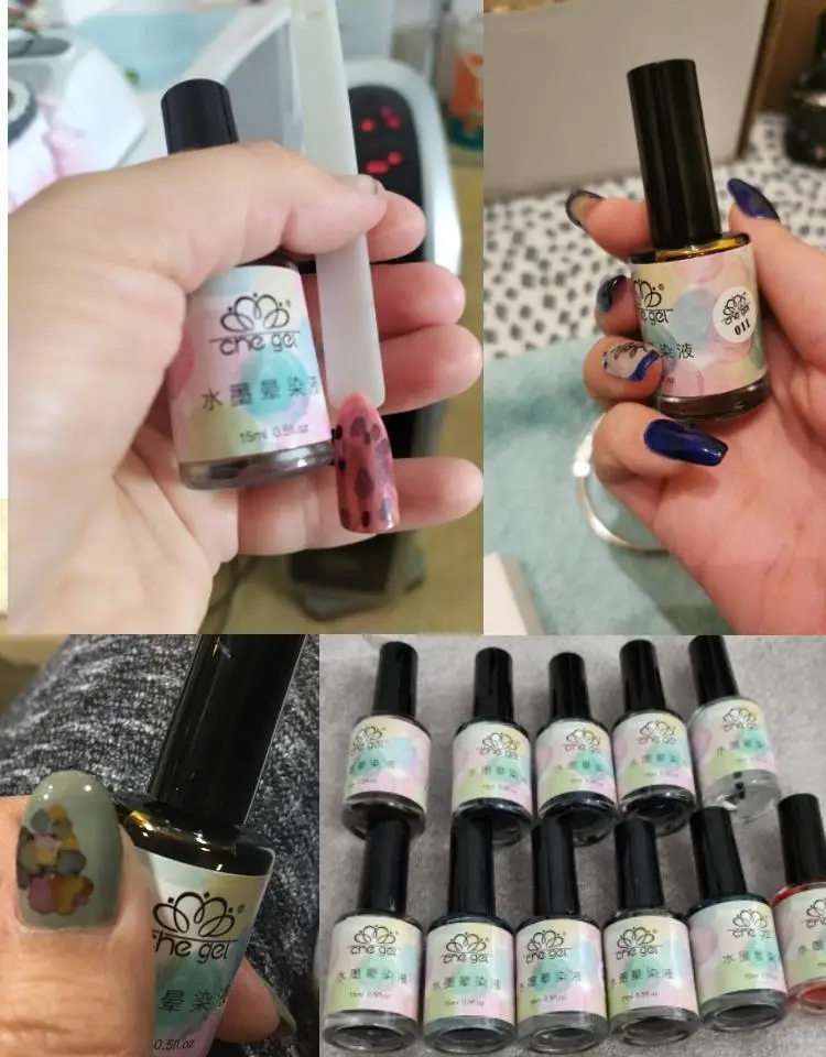 Жидкость для размазывания ногтей, может быть однотонной размазанной или многоцветной размазанной.