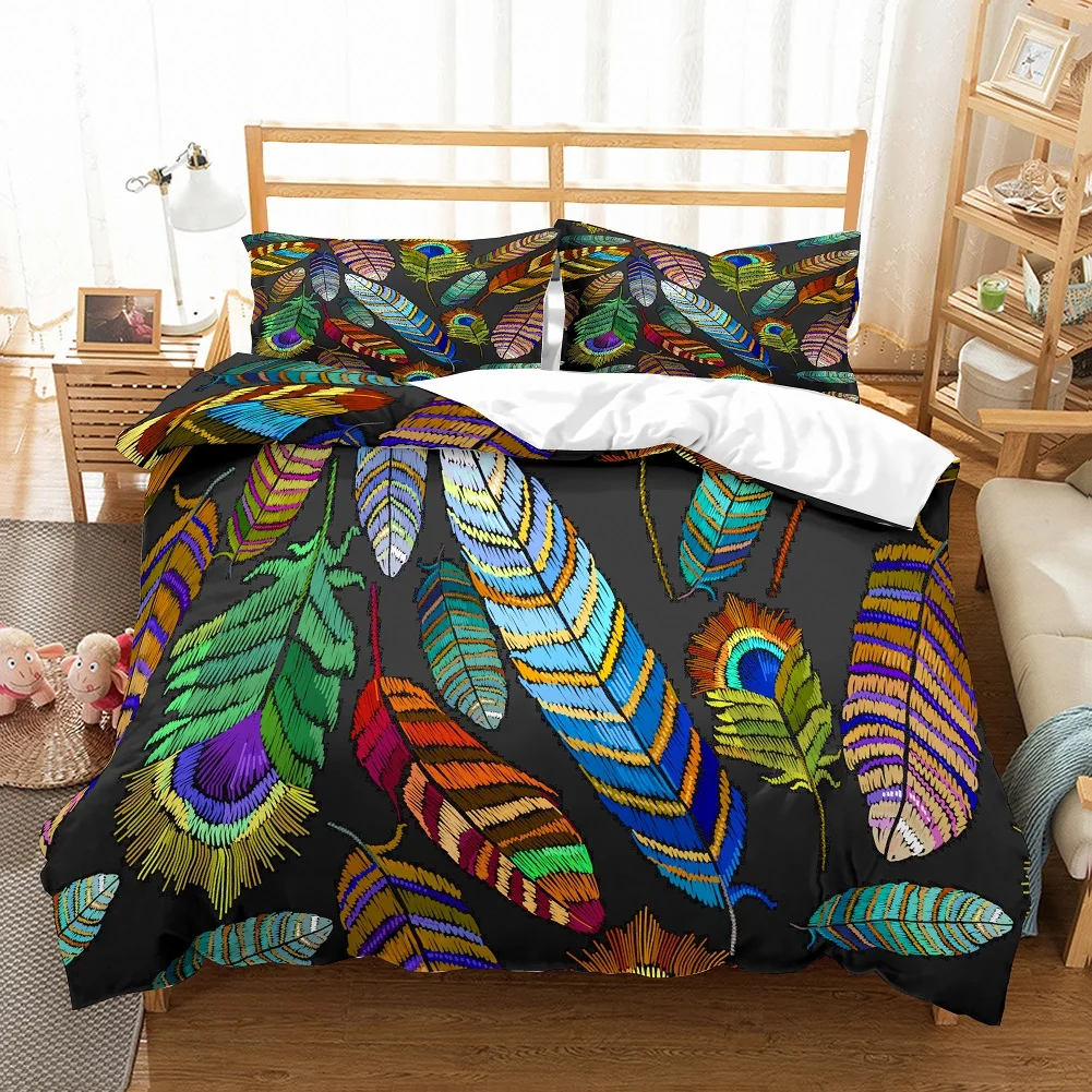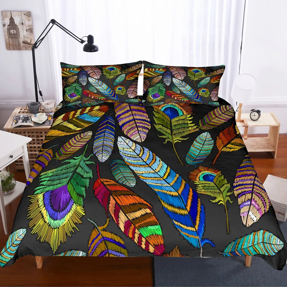 Microfiber Art Bedding Set Peacock Feather Duvet Cover Soft Pillow Case Home Decor Bedspread 2/3 Pieces Black/White Background