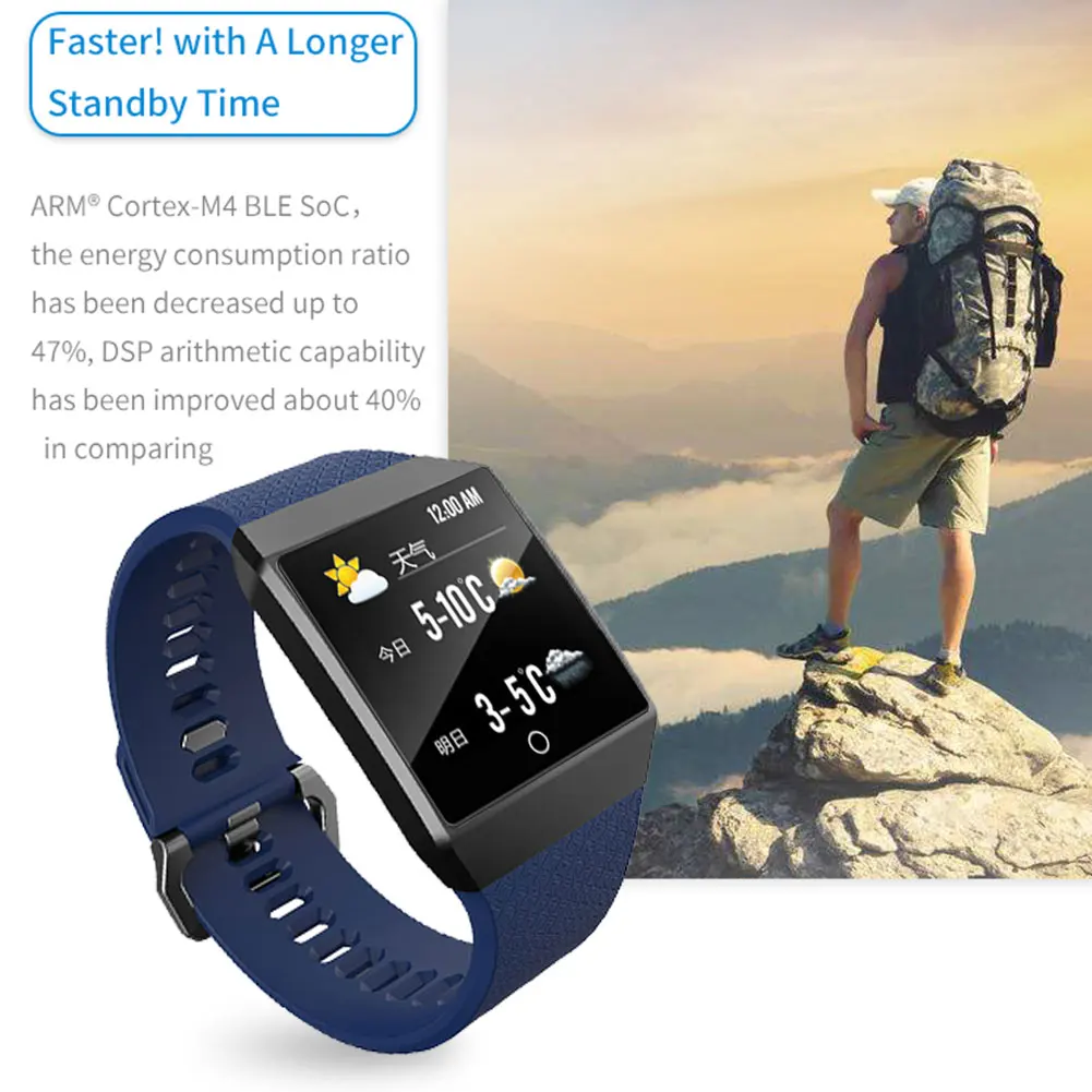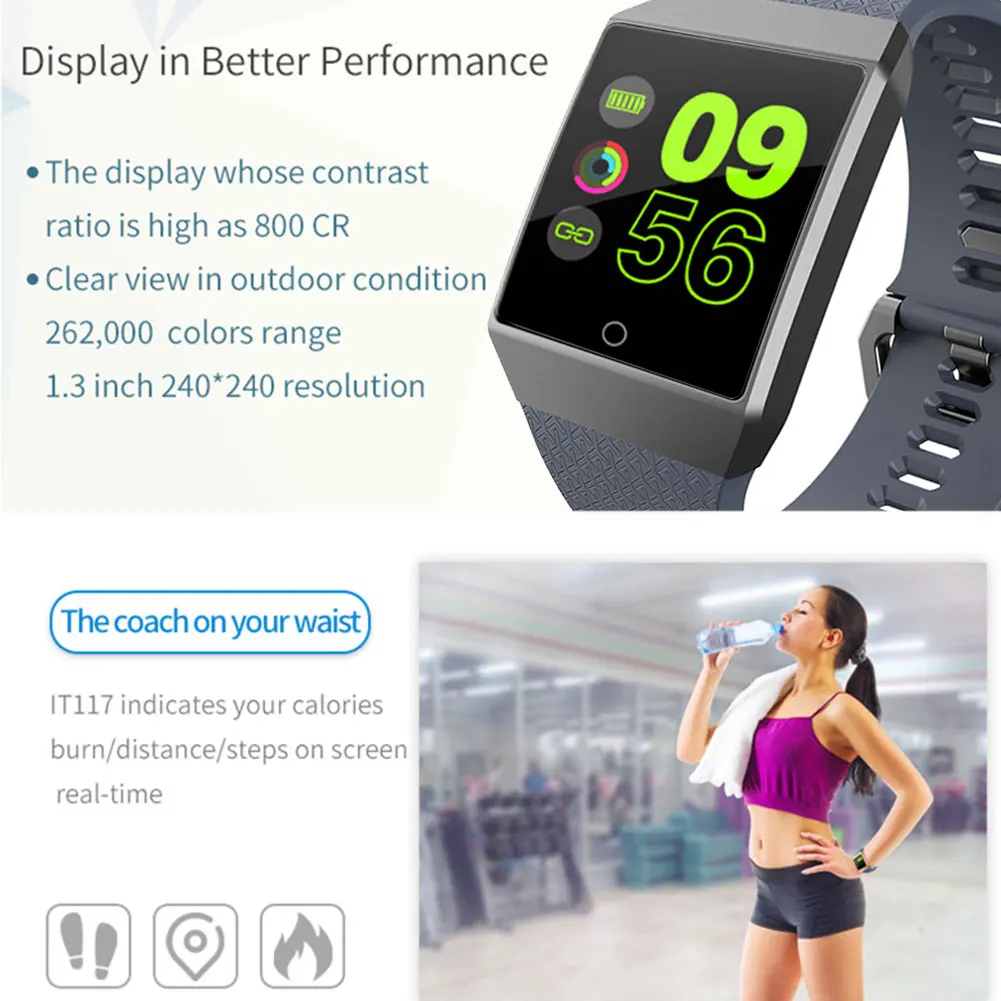 IT117 Air-grade сплав часы весь день монитор сердечного ритма, дисплей в лучшей производительности. Цветной экран 1,3 дюйма TFT, разрешение 240*240, делает экран более четким. Установите функцию напоминания о сидячем положении, когда вы сидите долгое время, будет напоминать вам о необходимости вставать вибрацией. Браслет контроля сна с функцией расширенной функции анализа сна, что позволяет хорошо овладевать сном. Пульт дистанционного управления камерой, фотографирование и запечатывание каждого запоминающегося момента. Встроенная полимерная батарея 160 мАч. Большая емкость литиевой батареи и низкое энергопотребление делает часы долгим сроком службы, Время в режиме ожидания в течение 30 дней. Соединения BT делают отображение синхронизации информации. Поддержка gps-карты на открытом воздухе, эта функция требует приложения и телефона, который не является встроенным gps-чипом. Класс IP67 водонепроницаемый, встроенный спортивный режим плавания. Функции: gps, толчок информации, мониторинг здоровья, датчик движения, интеллектуальное напоминание, анализ сна, подсчет шагов, развлечения, удаленный автотаймер, защита от потери, информация о погоде, яркий экран запястья жизни, и т. д. Важно: Убедитесь, что Bluetooth вашего смартфона включен и подключен к смартфону через приложение «GetFitPro» вместо меню Bluetooth