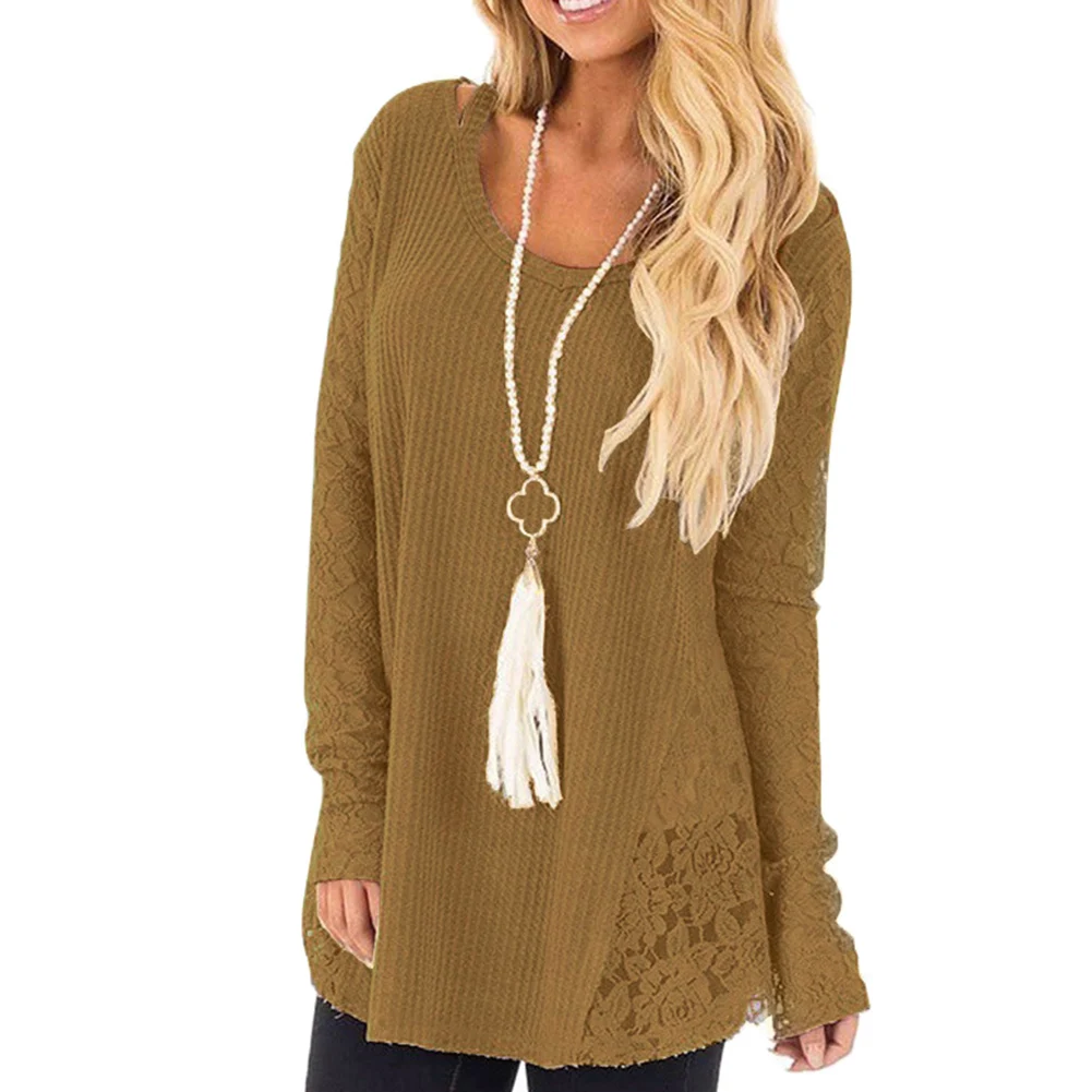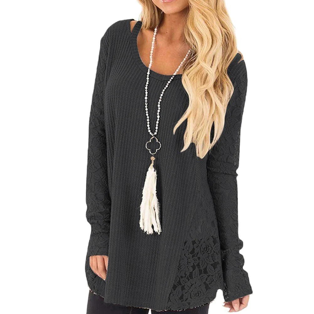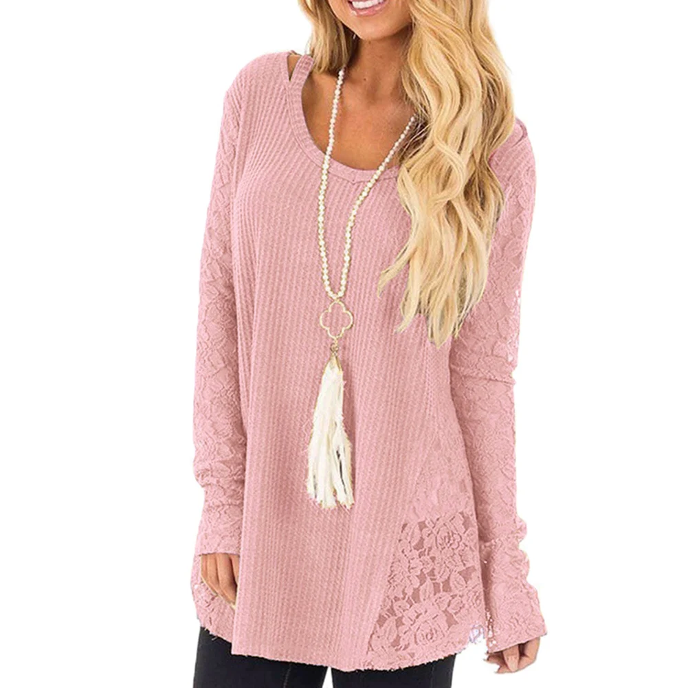 Осенняя Женская свободная однотонная кружевная блузка с круглым вырезом и длинным рукавом