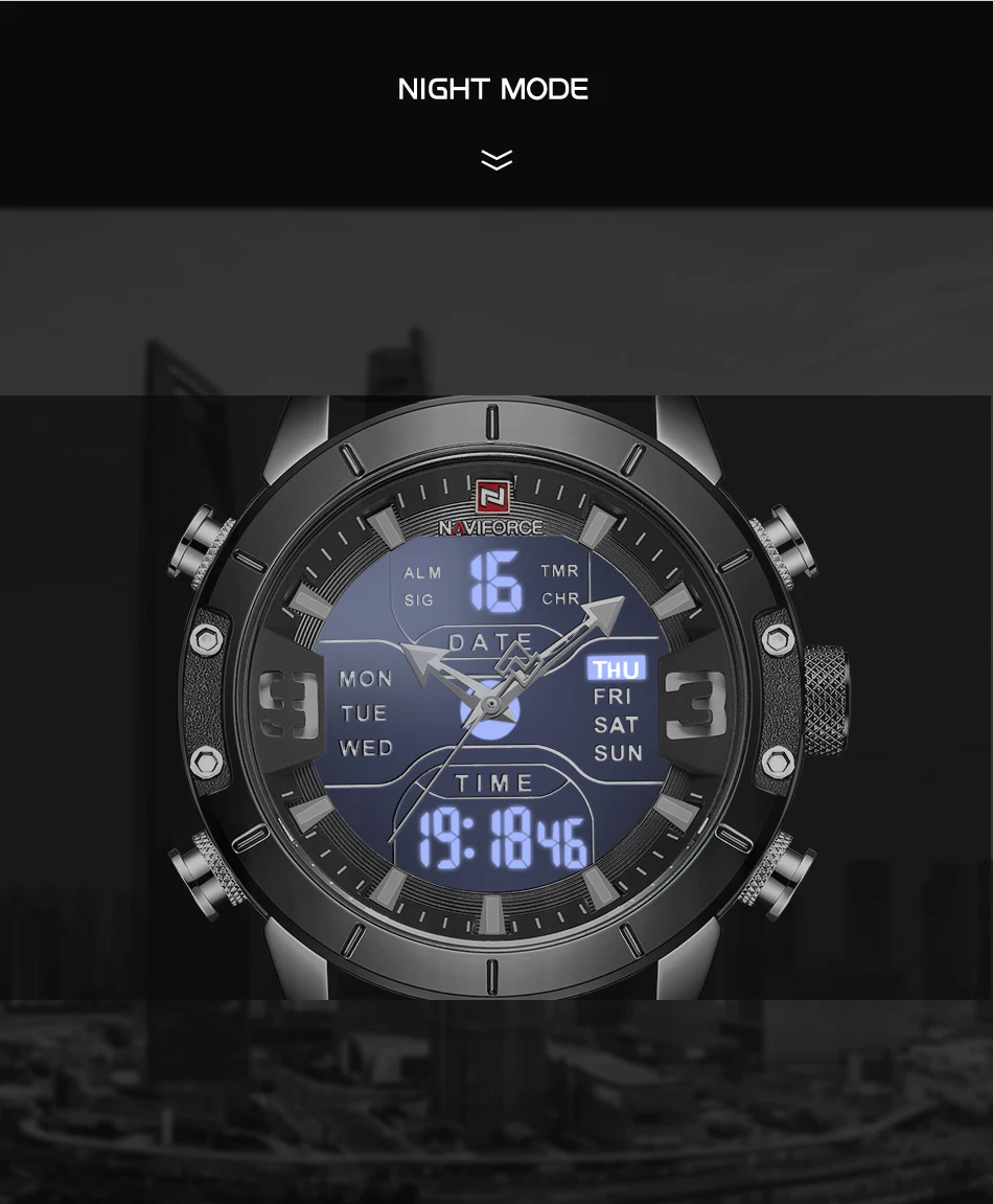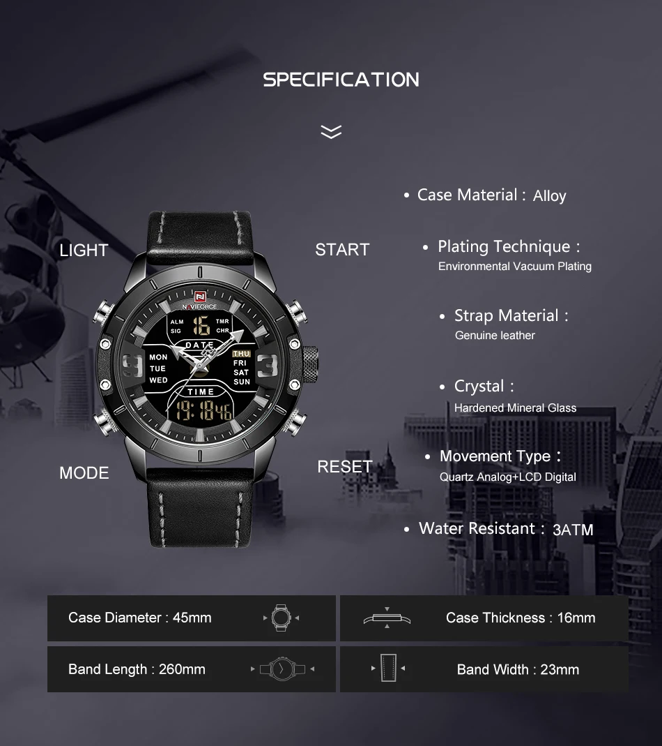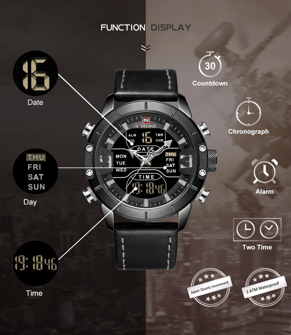 Особенности:Время, 30 м Водонепроницаемость, отображение даты неделиСветящийся многофункциональный хронограф
