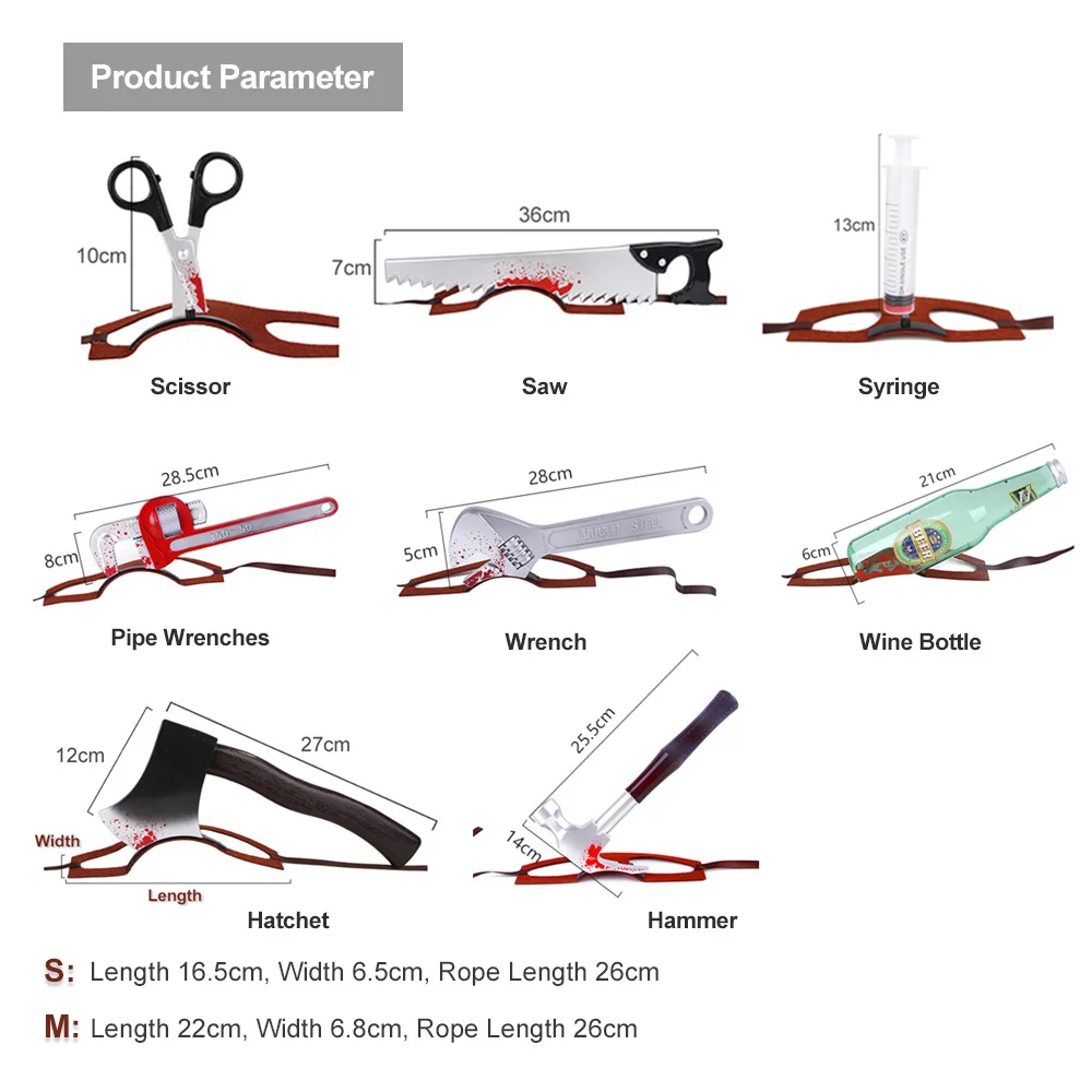 Стиль: топор/ножницы/пила Материал: пластик + войлочная ткань Случаи: Хэллоуин/Рождество/Вечеринка/забавные фото реквизит Повязка на голову Size↓ S: длина 16,5 см, ширина 6,5 см, длина веревки 26 см M: длина 22 см, ширина 6,8 см, длина веревки 26 см Пожалуйста, помогите проверить размер перед покупкой.