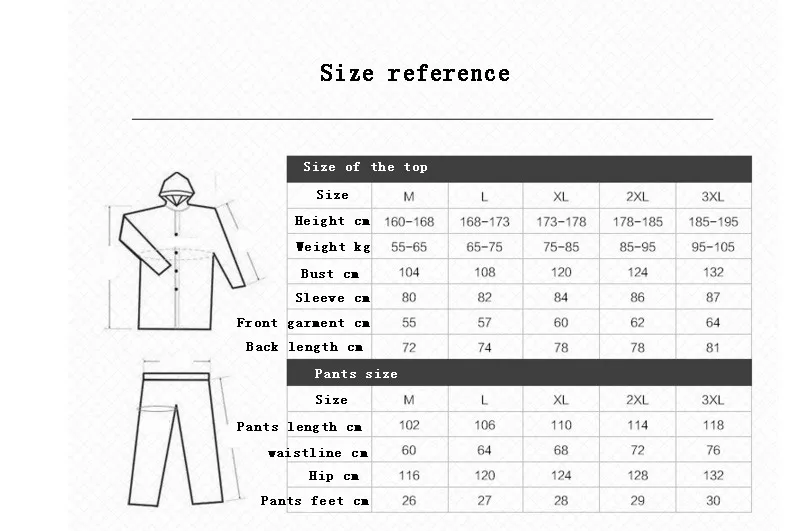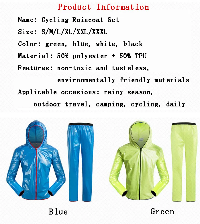 Информация о продукте: Название: Комплект велосипедного плаща Размер: S/M/L/XL/XXL/XXXL Цвет: зеленый, синий, белый, черный Материал: 50% полиэстер + 50% ТПУ Характеристики: нетоксичные и безвкусные, экологически чистые материалы Применимые случаи: сезон дождей, путешествия на открытом воздухе, Кемпинг, Велоспорт, ежедневно Одежда для детей: Высота: M/160-168 см, L/168-173 см, XL/173-178 см, XXL/178-185 см, XXXL/185-195 см, Вес: M/55-65 кг, L/65-75 кг, XL/75-85 кг, XXL/85-95 кг, XXXL/95-105 кг, Бюст: M/104 см, L/108 см, XL/112 см, XXL/116 см, XXXL/120 см, Длина рукава: M/80 см, L/82 см, XL/84 см, XXL/86 см, XXXL/87 см, Брюки: Длина брюк: M/102 см, L/106 см, XL/110 см, XXL/114 см, XXXL/118 см, Обхват талии: M/60 см, L/64 см, XL/68 см, XXL/72 см, XXXL/76 см Бедра: M/116 см, L/120 см, XL/124 см, XXL/128 см, XXXL/132 см, Длина стопы: M/26 см, L/27 см, XL/28 см, XXL/29 см, XXXL/30 см,