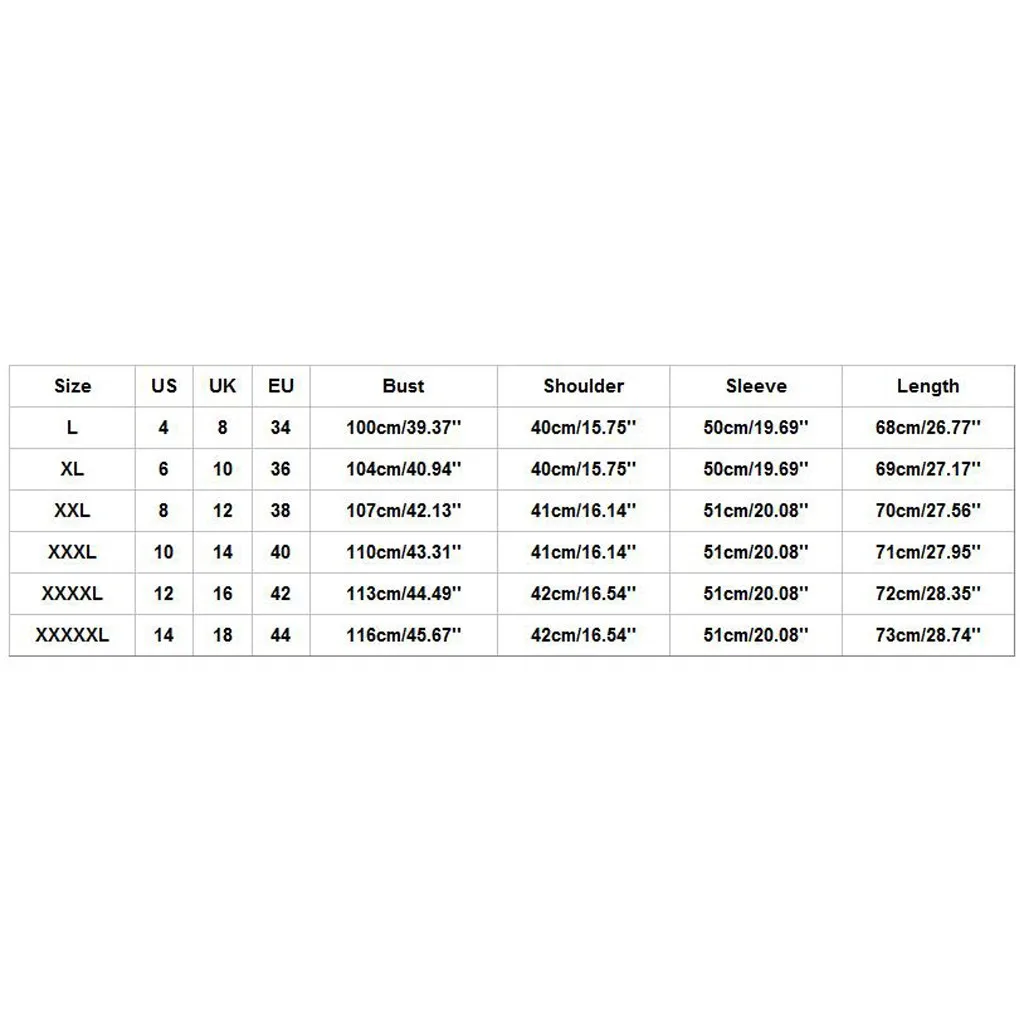 Размер Свяжитесь с нами Великобритания ЕС Обхват груди Сумка на плечо Рукава Длина L 4 8 34 100 см/39,37'' 40 см/15,75'' 50 см/19,69'' 68 см/26,77'' XL 6 10 36 104 см/40,94'' 40 см/15,75'' 50 см/19,69'' 69 см/27,17'' XXL 8 12 38 107 см/42,13'' 41 см/16,14'' 51 см/20,08'' 70 см/27,56'' XХХL 10 14 40 110 см/43,31'' 41 см/16,14'' 51 см/20,08'' 71 см/27,95'' XXXXL 12 16 42 113 см/44,49'' 42 см/16,54'' 51 см/20,08'' 72 см/28,35'' XXXXXL 14 18 44 116 см/45,67'' 42 см/16,54'' 51 см/20,08'' 73 см/28,74''
