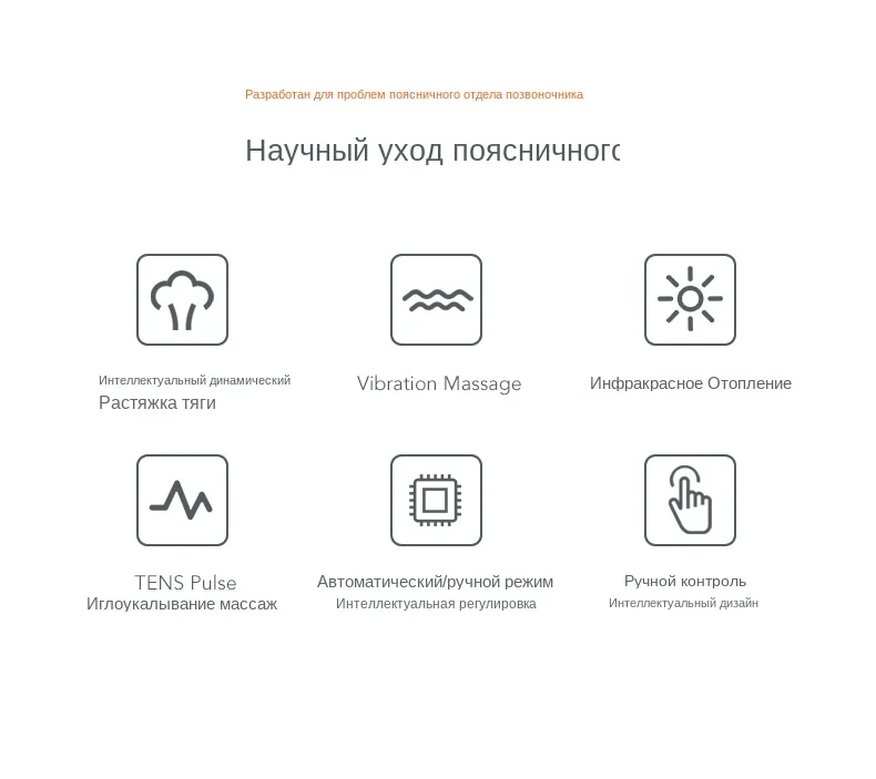 Массажер предназначен для поясницы. Он сочетает в себе тягу, массаж, тепло и электротерапию с акупунктурными и другими функциями, чтобы уменьшить усталость и боль в пояснице и других частях тела. 1. Электротерапия с иглоукалыванием и, Электротерапия пластырь может быть применен к множественным частям тела, чтобы снять боль и усталость в области использования. 2. Интеллектуальная Тяговая функция, используя динамическую возвратно-поступательную функцию тяги, толкая Поясничный позвонок вверх, тяга и растяжение поясничных позвонков и мышц, снимая усталость поясничных мышц и уменьшая боль в пояснице и спине; 3. Два автоматических режима, различный дизайн высоты тяги, пользователи выбирают режим, который им подходит. 3. Ручной режим, пользователь может вручную регулировать высоту тяги в соответствии с его или ее уровнем комфорта, выбрать турнон или выключить функцию нагрева и функцию вибрационного массажа. 4. Дизайн вибрационного массажа с обеих сторон талии, способствует циркуляции крови и снимает усталость мышц талии; 5. Инфракрасная технология нагрева, способствует циркуляции крови, уменьшая боль в поясничной области и спине; 6. Эргономичный дизайн кривой, разумная поддержка поясницы;