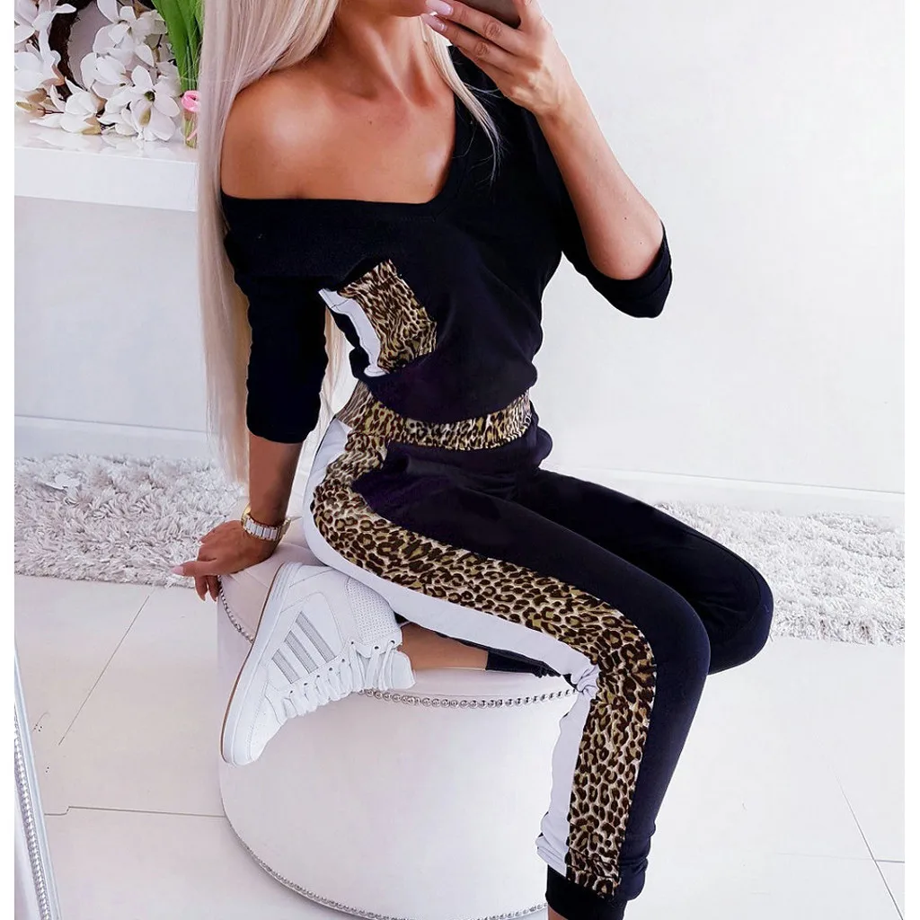 Женский леопардовый принт, v-образный вырез, сексуальный повседневный костюм, толстовка, два предмета