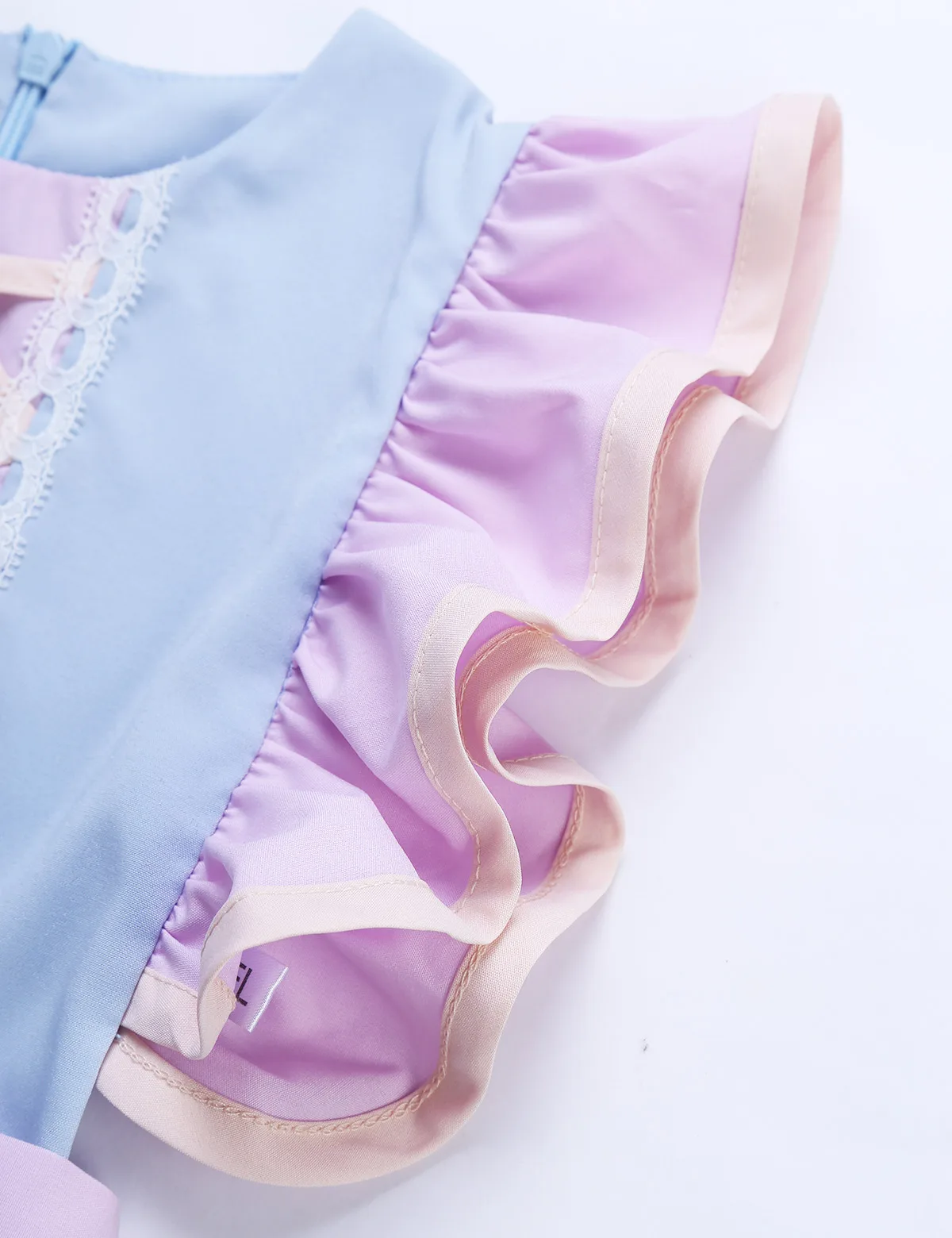 Рукава-флаттеры с рюшами, круглый вырез горловины, лиф верха с деталями на шнуровке спереди. Застежка на потайную молнию сзади.