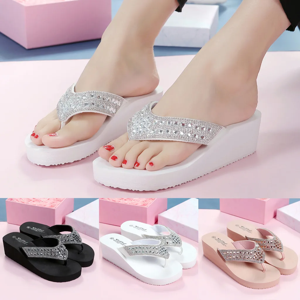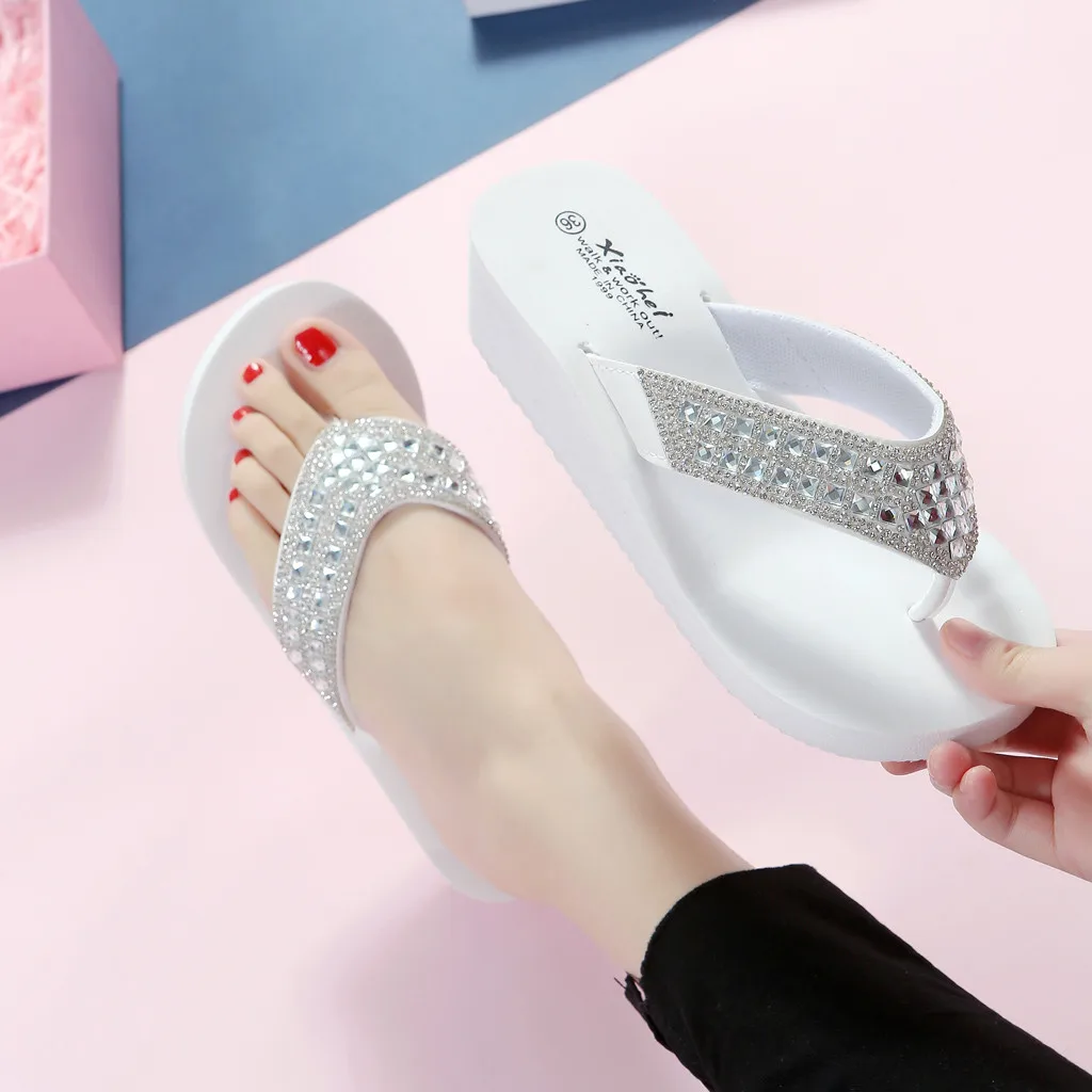 Женские Вьетнамки; Летние повседневные Модные пикантные Милые Пляжные сандалии со стразами; нескользящие сандалии на танкетке и не сужающейся книзу платформе