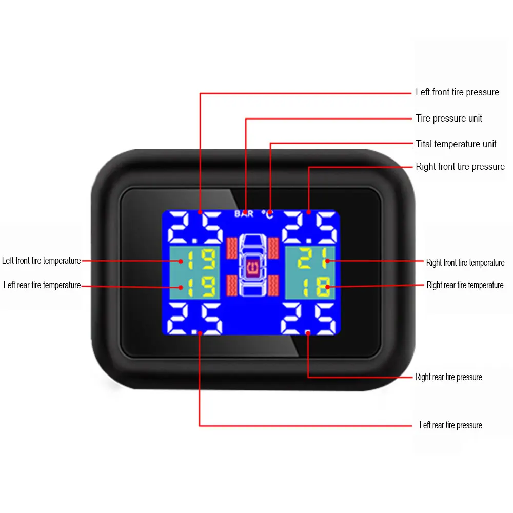 * 4 датчика с водонепроницаемой и антикоррозийной технологией защиты от кражи, что делает его полностью квалифицированным в дождливые дни. Высокая чувствительность, хорошая точность для измерения давления и температуры.