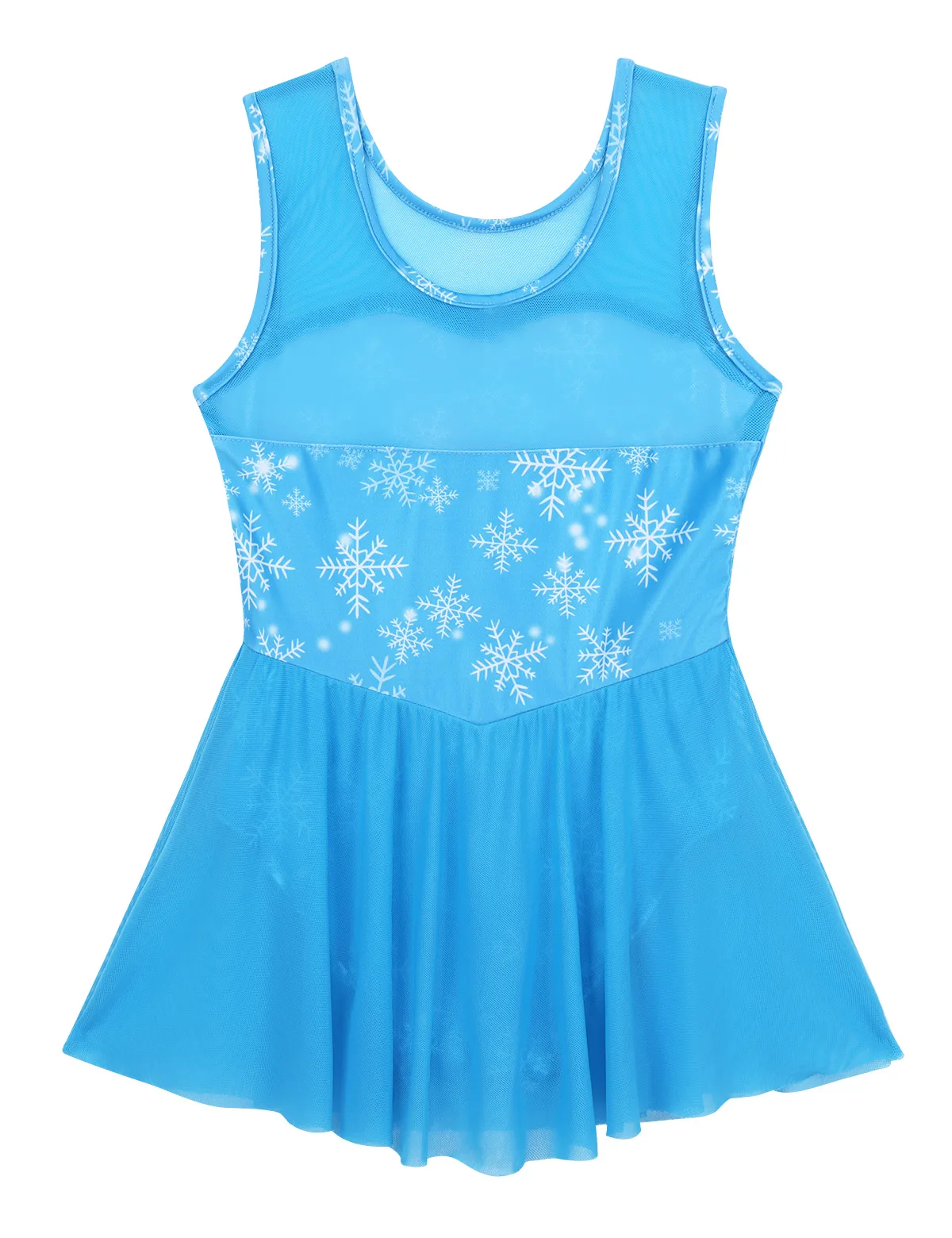 Без рукавов, с круглым вырезом, с сетчатой вставкой спереди и сзади. Купальник с рисунком снежинки.