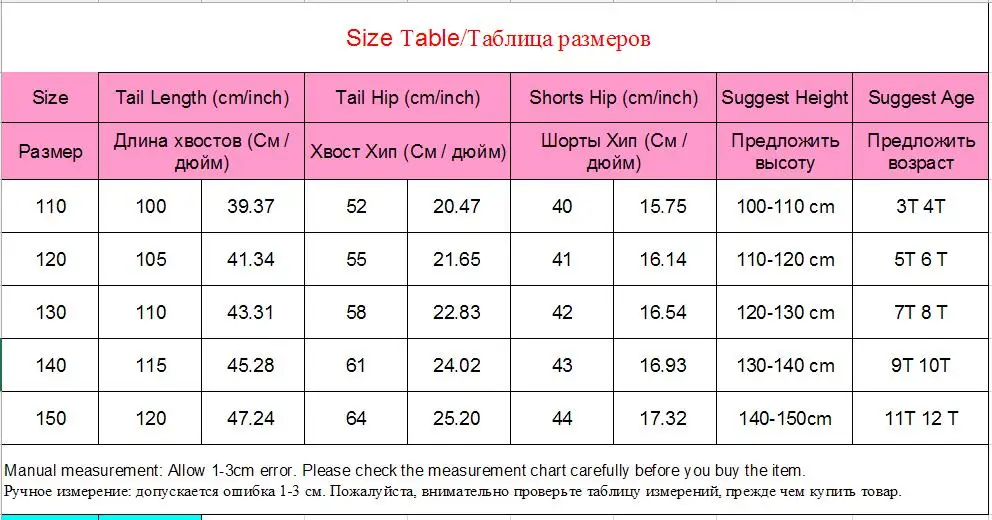 Размеры Длина (хвост) обхват бёдер; Рост подходит для возраста