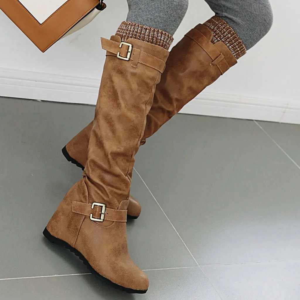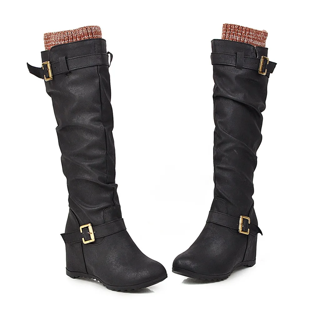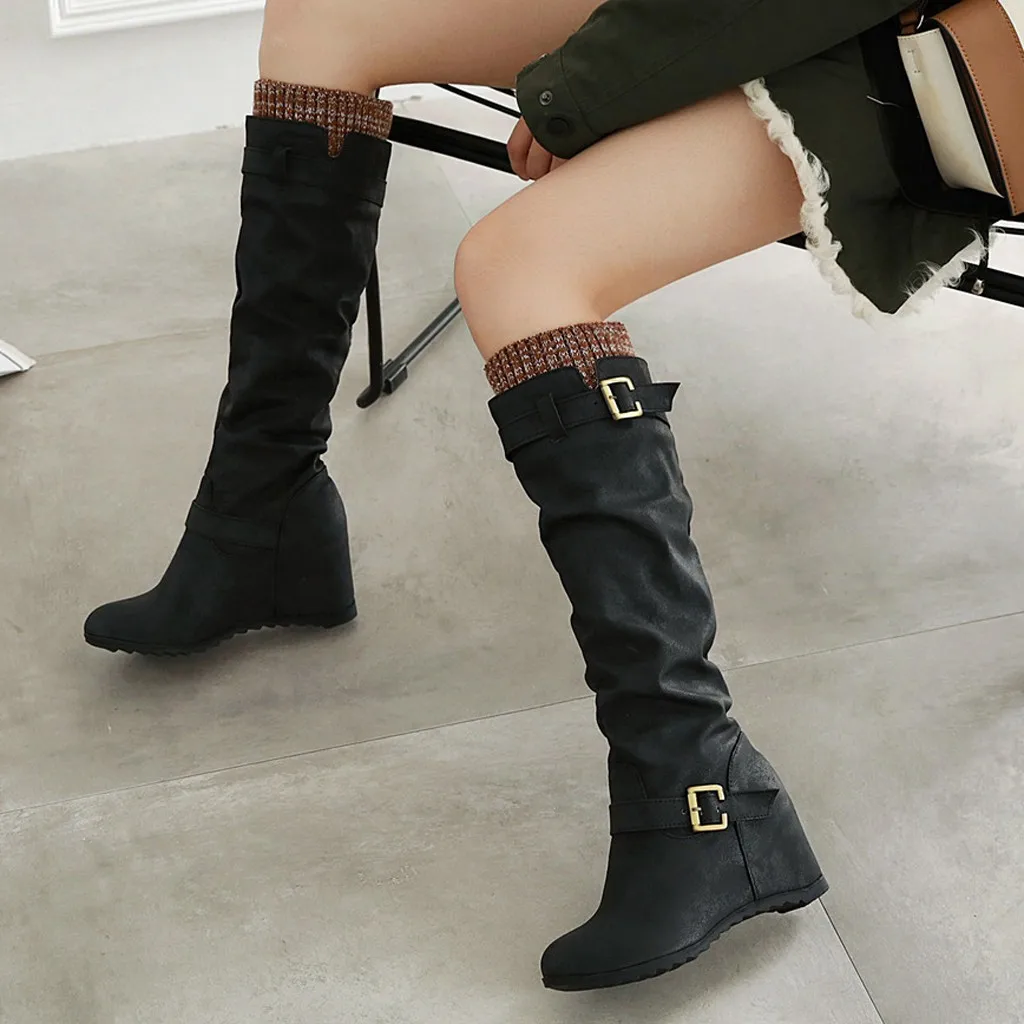 Женские сапоги до колена на танкетке без шнуровки повседневные ботинки на квадратном каблуке средней высоты