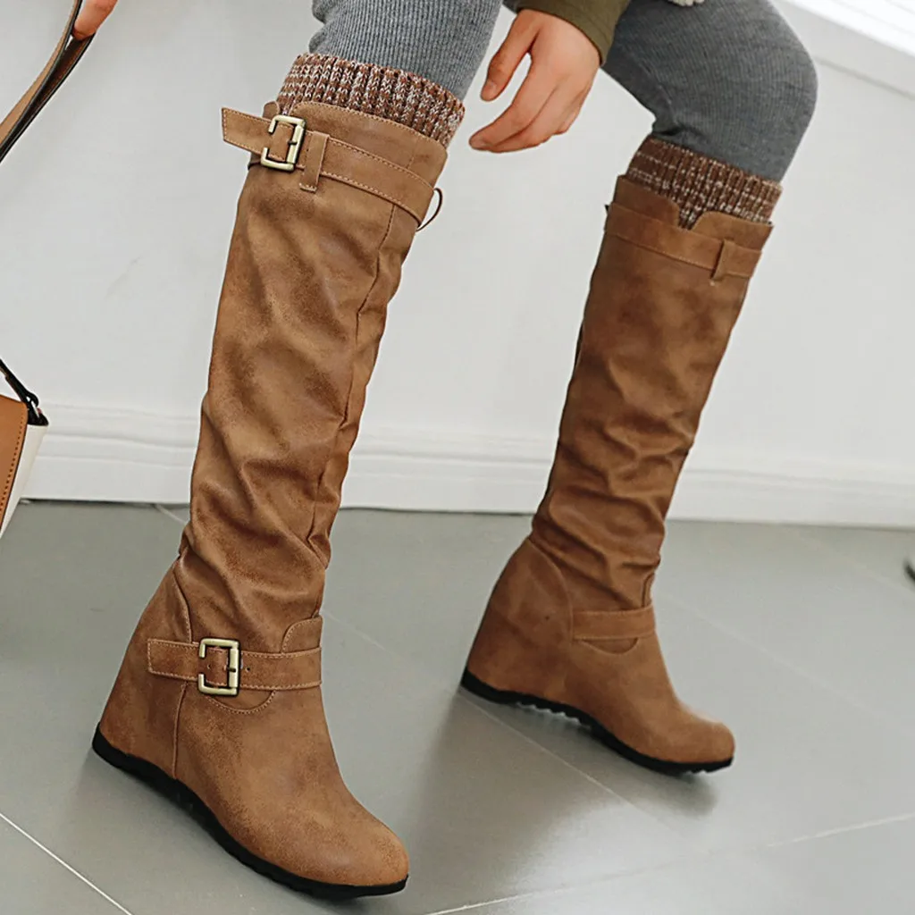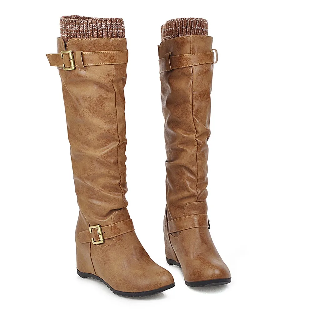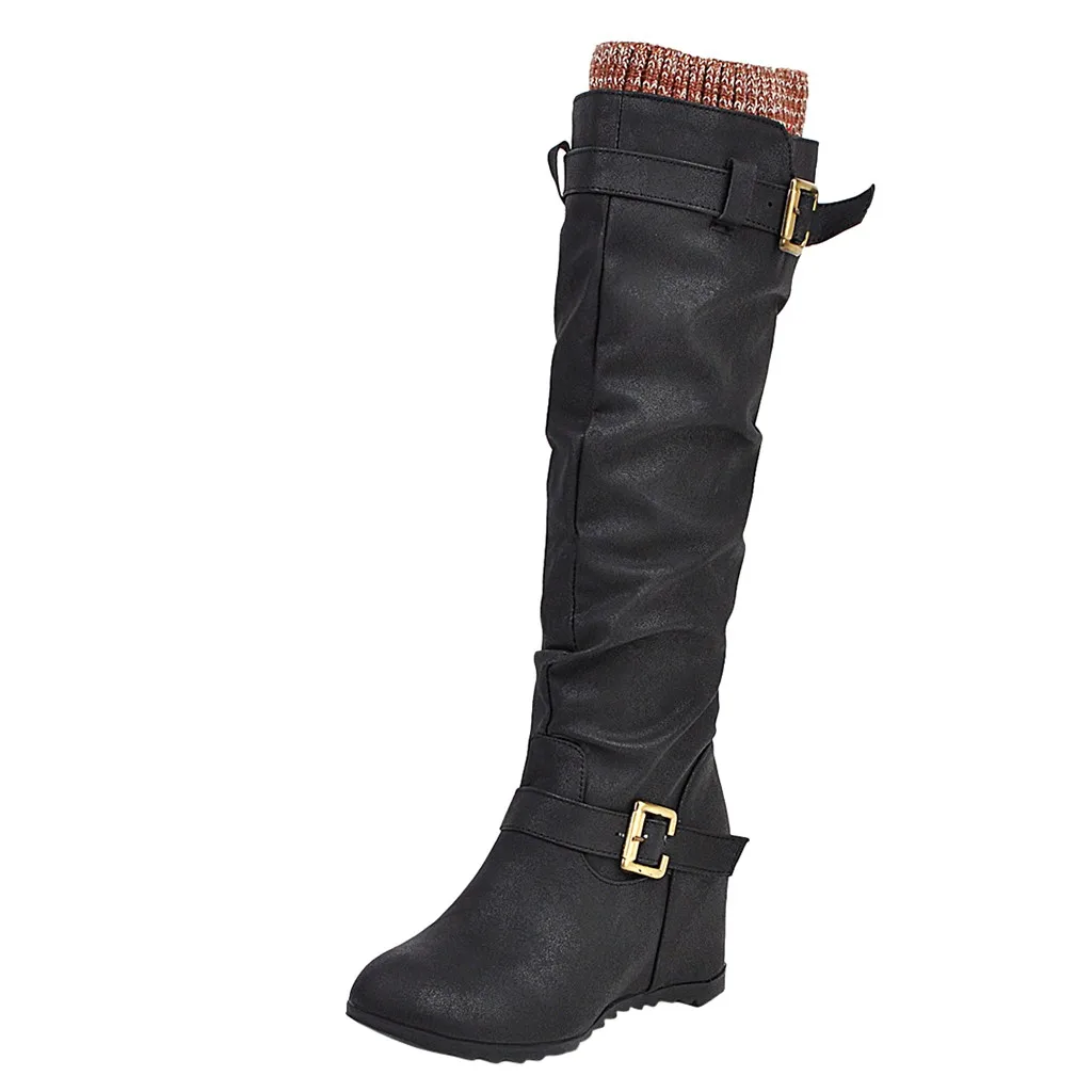 Женские сапоги до колена на танкетке без шнуровки повседневные ботинки на квадратном каблуке средней высоты