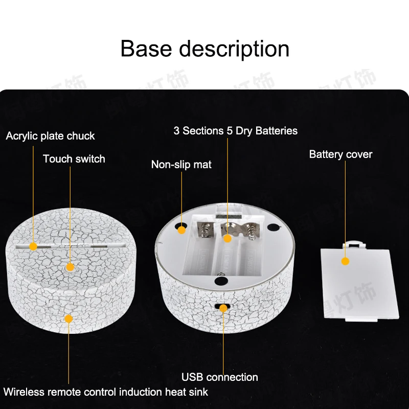 Наименование товара: Новинка Светодиодный 3D ночной Светильник Напряжение: 5 В Ватт: 2 Вт Цвета: 7 цветов Управление: 1,Touch,2,Touch + Rmote (Сенсорный пульт) Базовый размер: d85xh37.4мм Питание: 1, аккумулятор (не входит в комплект) 2, usb-провод