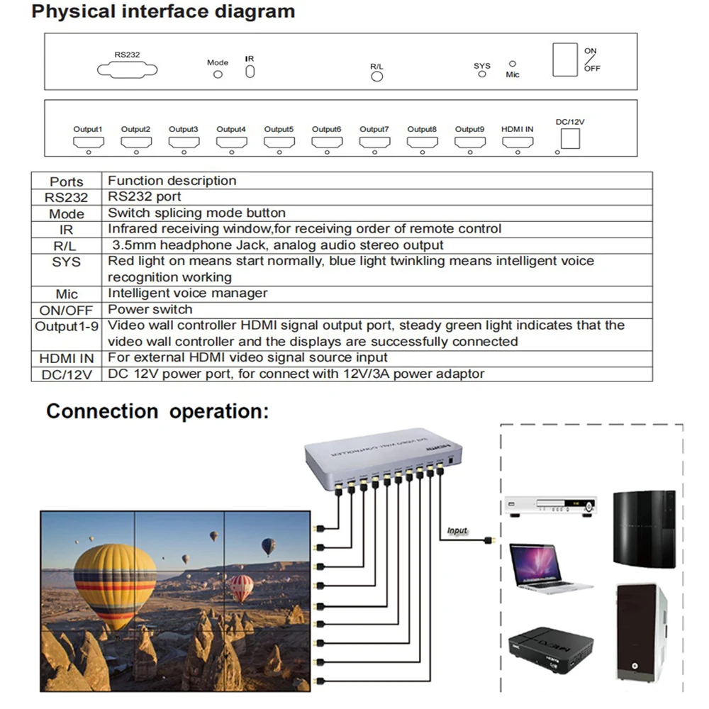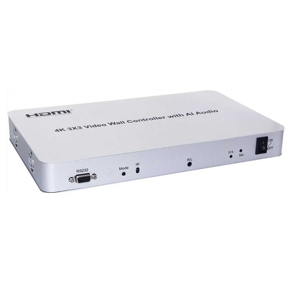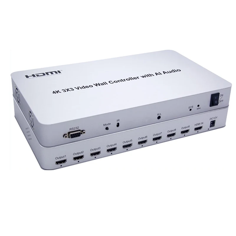 4K3X3 splicer с интеллектуальным голосом, поддерживает 1 источник сигнала HDMI вход, 9 HDMI выход, основная функция состоит в том, чтобы разделить полный HDMI сигнал изображения высокой четкости на 9 штук, а затем распределить их до 9 единиц видео дисплея (таких как блоки задней проекции, LCDs) телевизор и т. Д.), С помощью 9 hdmi-дисплеев высокой четкости для формирования большого динамического экрана изображения.