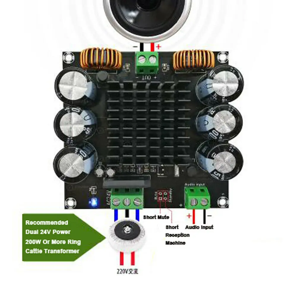 1. Выход BTL режим, мощность может достигать 420 Вт под 4Ω нагрузки. 2. Большое магнитное кольцо самоиндукции, медный сердечник, намотка провода. 3,2*3 Большая емкость электролитический конденсатор 4.1.6 мм Двухслойное стекло высокой плотности волоконно схема