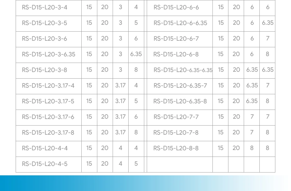 Например, d1xd2 (мм) : 2x2 , 2x3 , 2x4 , 2x5 ,2x6 , 2x7 , 2x8 , 3x3 , 3x3,17, 3x4, 3x5 , 3x6 , 3x6,35, 3x8, 3,17x4 3,17x5, 3,17x6, 3,17x8 , 4x4 , 4x5 , 4x6 , 4x6,35, 4x8 , 5x5, 5x6 , 5x6,35, 5x7 , 5x8 , 6x6 , 6x6,35, 6x7 , 6x8, 6,35x6,35, 6,35x7, 6,35x8 , 7x7 , 7x8 , 8x8