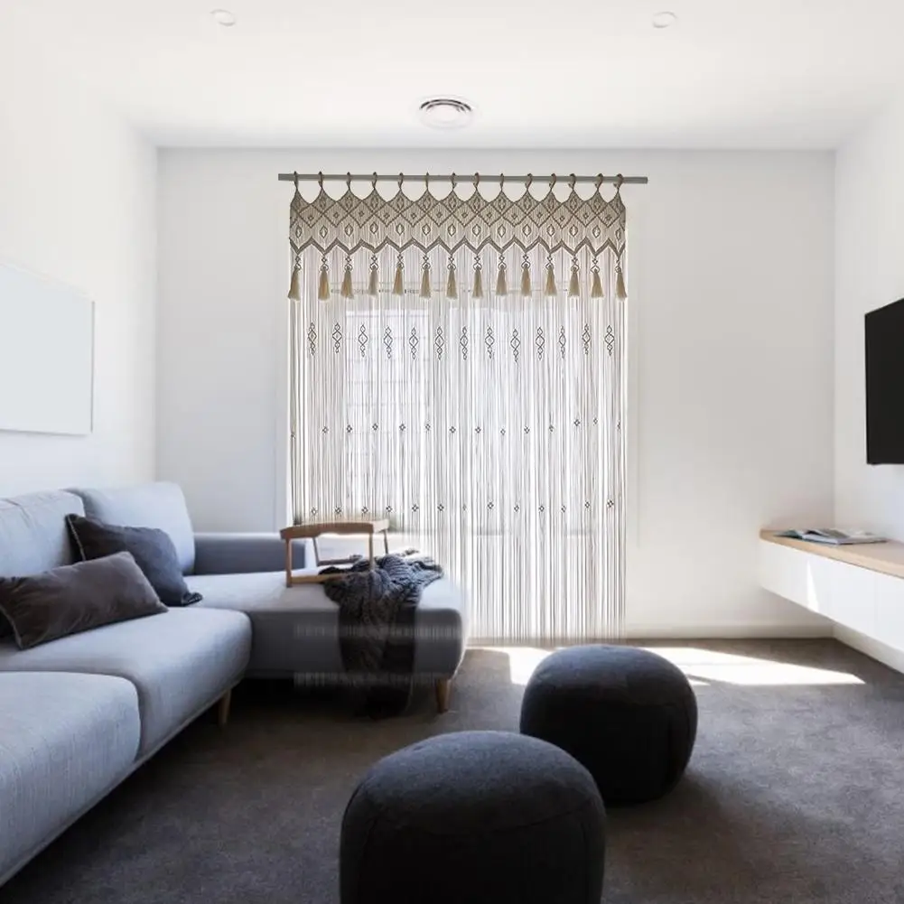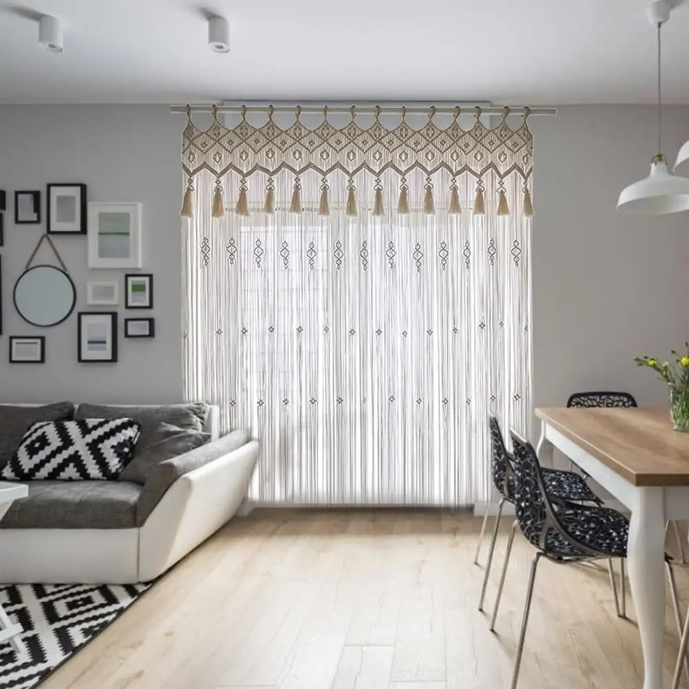 Штора полностью ручной работы, веревка легко запутывается, вы можете просто мягко встряхнуть занавеску после его получения, натуральный Хлопковый Канат может иметь некоторый вкус, что вызвана мастерством хлопка, то, что вам нужно, это повесить занавеску на стену на несколько дней, Затем вкус исчезнет.