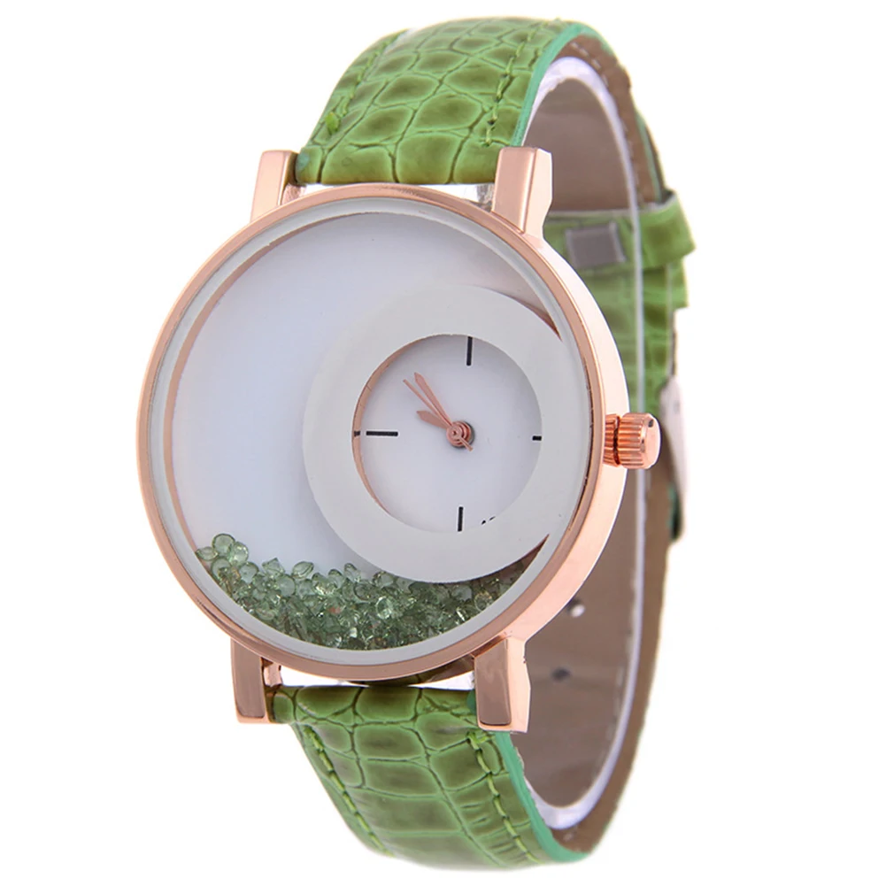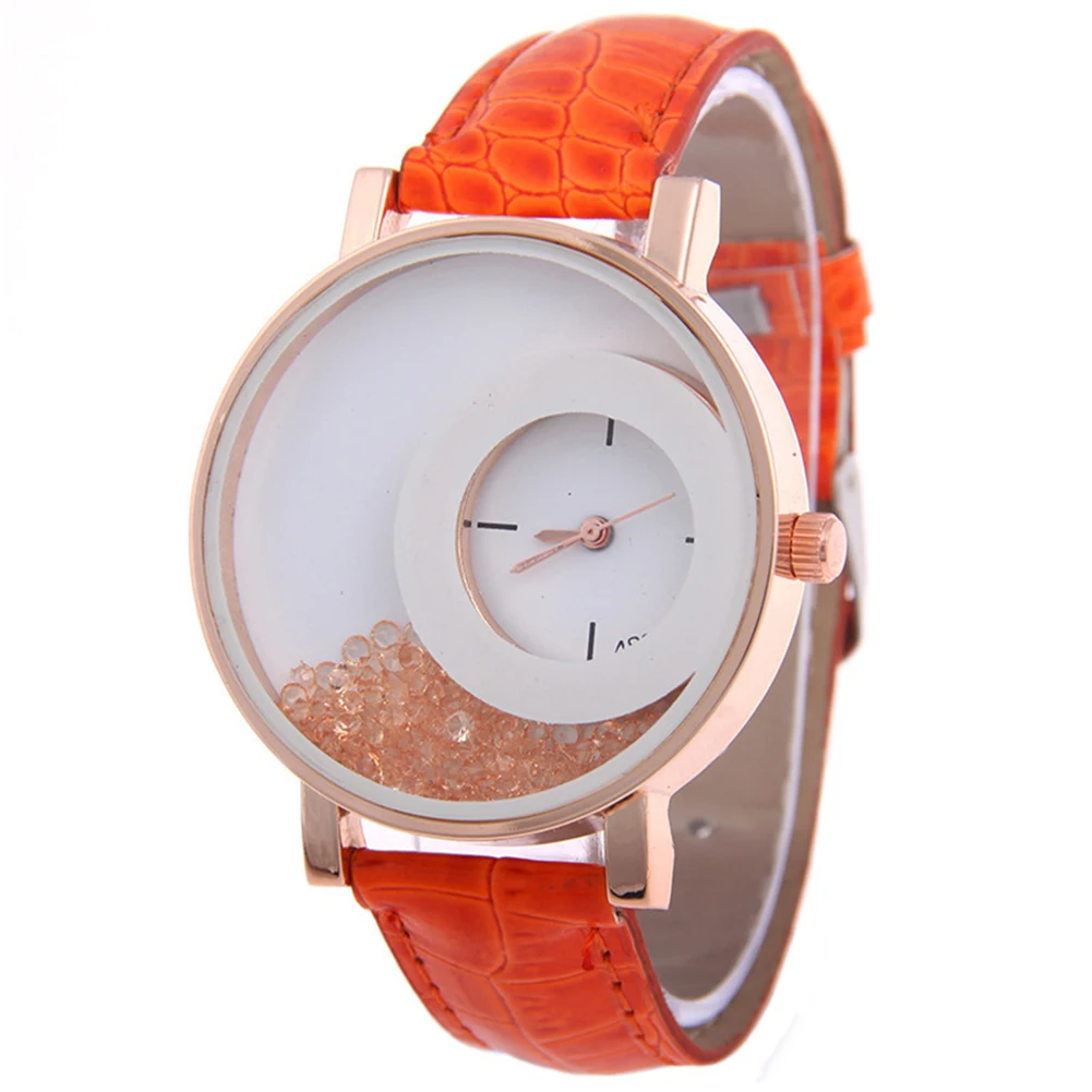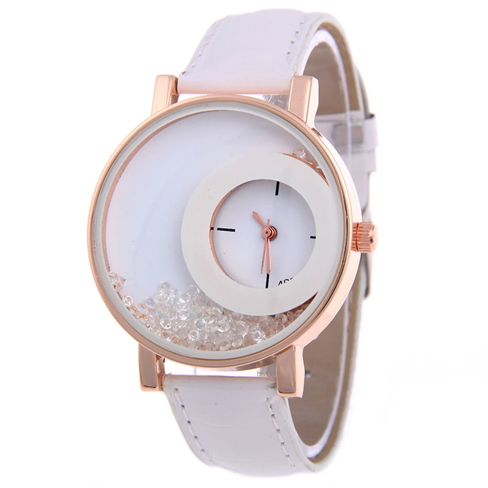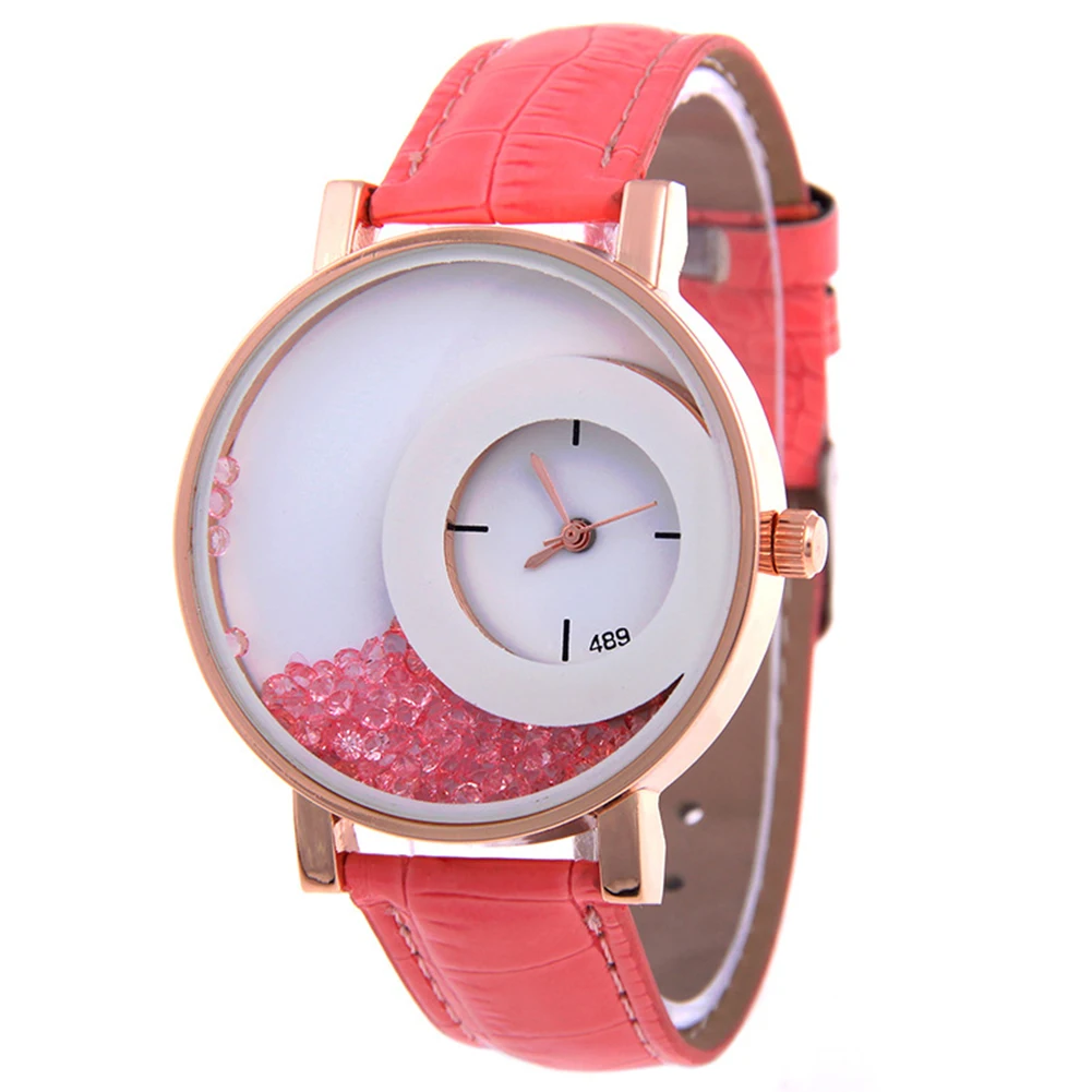 Забавные Quicksand стразы, дизайн, круглый циферблат, регулируемый ремешок из искусственной кожи, аналоговые кварцевые часы для женщин, специальный подарок для женщин