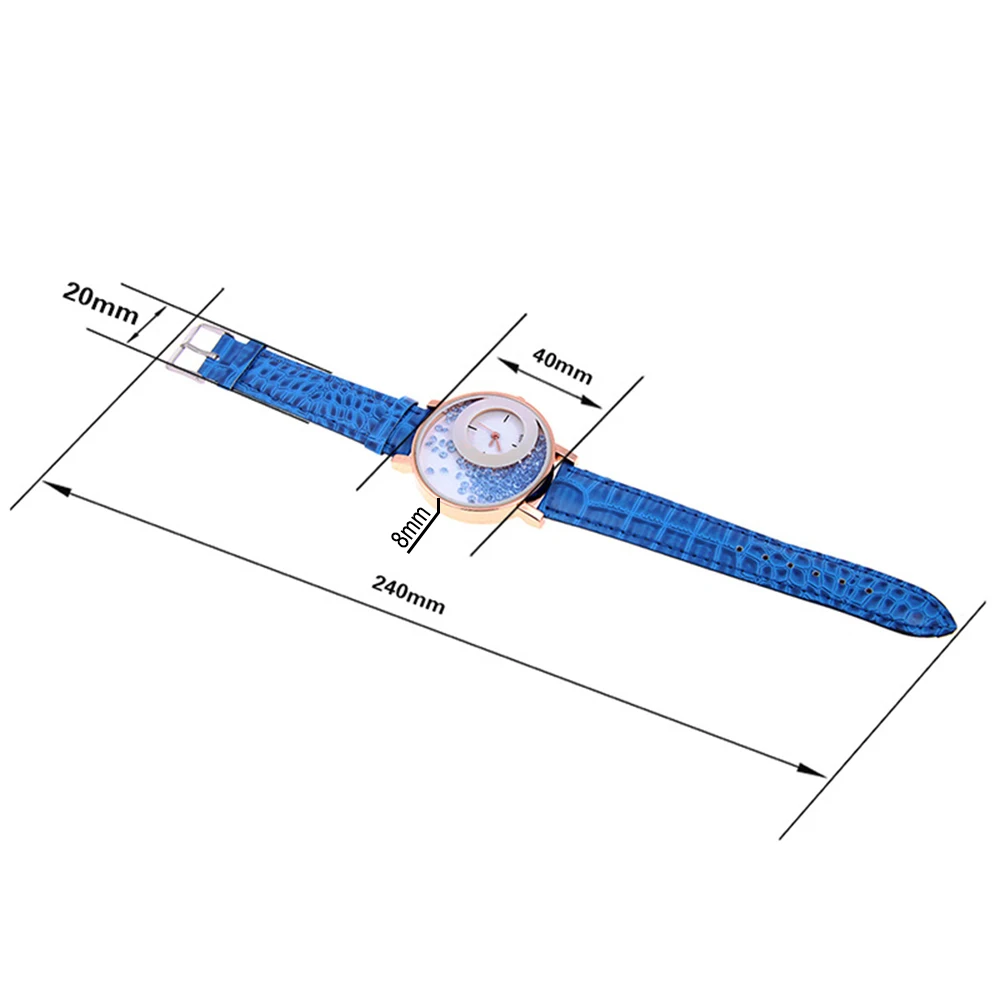 Особенности: Стразы с зыбучим песком, круглый циферблат, без цифр, регулируемый