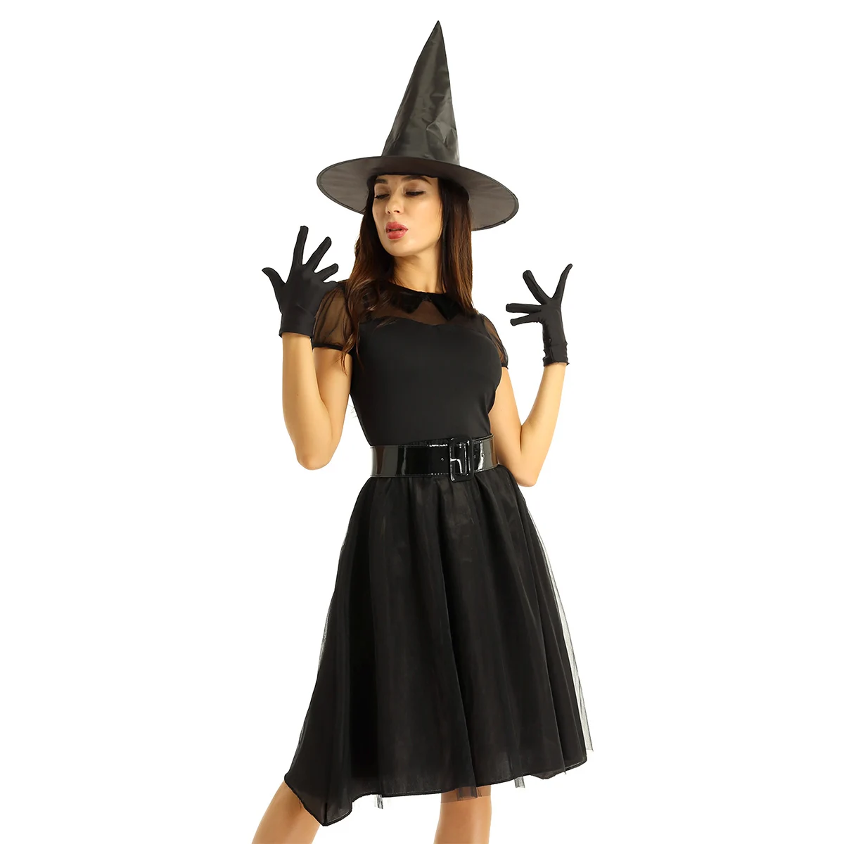 Лучший костюм злой ведьмы в паре с поясом, головной убор с острым носком и парой перчаток. Хорошая эластичная ткань, мягкая и удобная в носке.
