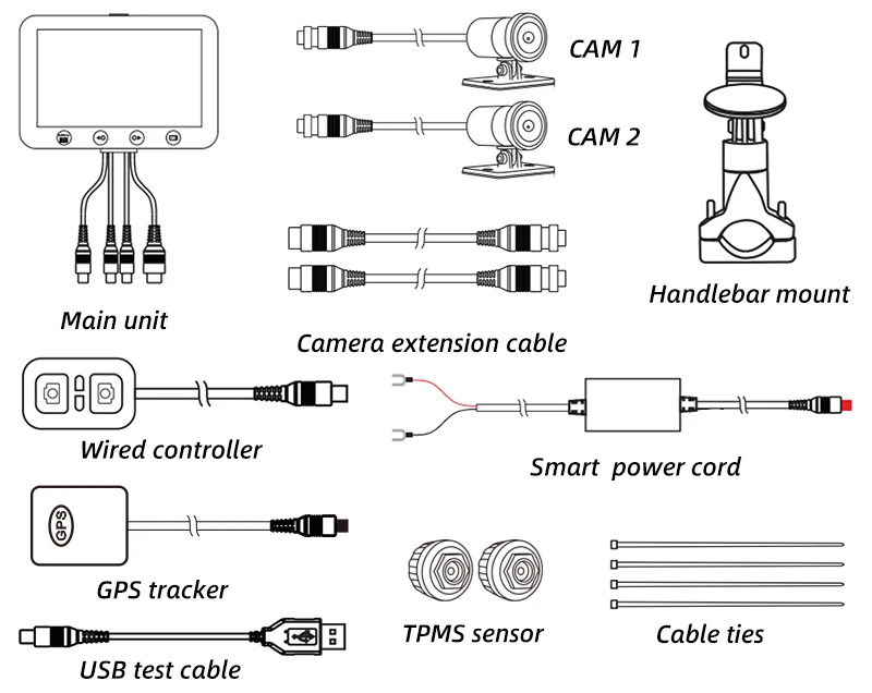 2 канальный отдельно камеры с каждым стандартный 2,0 м кабель-удлинитель для переднего и заднего вида запись. Один на передней и один на задней части вашего велосипеда, который будет записывать все, что происходит перед вами и позади вас в любое время. Идеально подходит для мотоциклов, скутеров, автомобилей, UTV, ATV и любых других транспортных средств.