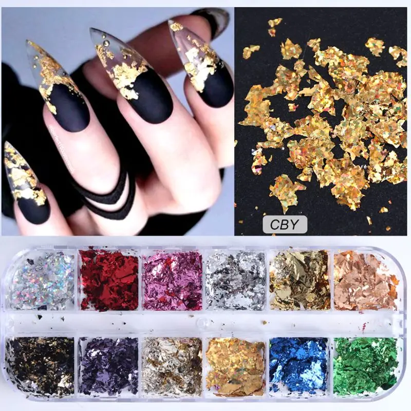 12 Горшков креативные ГВОЗДИ Художественные фольга чипы, с золотыми, серебряными, радужными и медными цветами в различных формах и размерах.