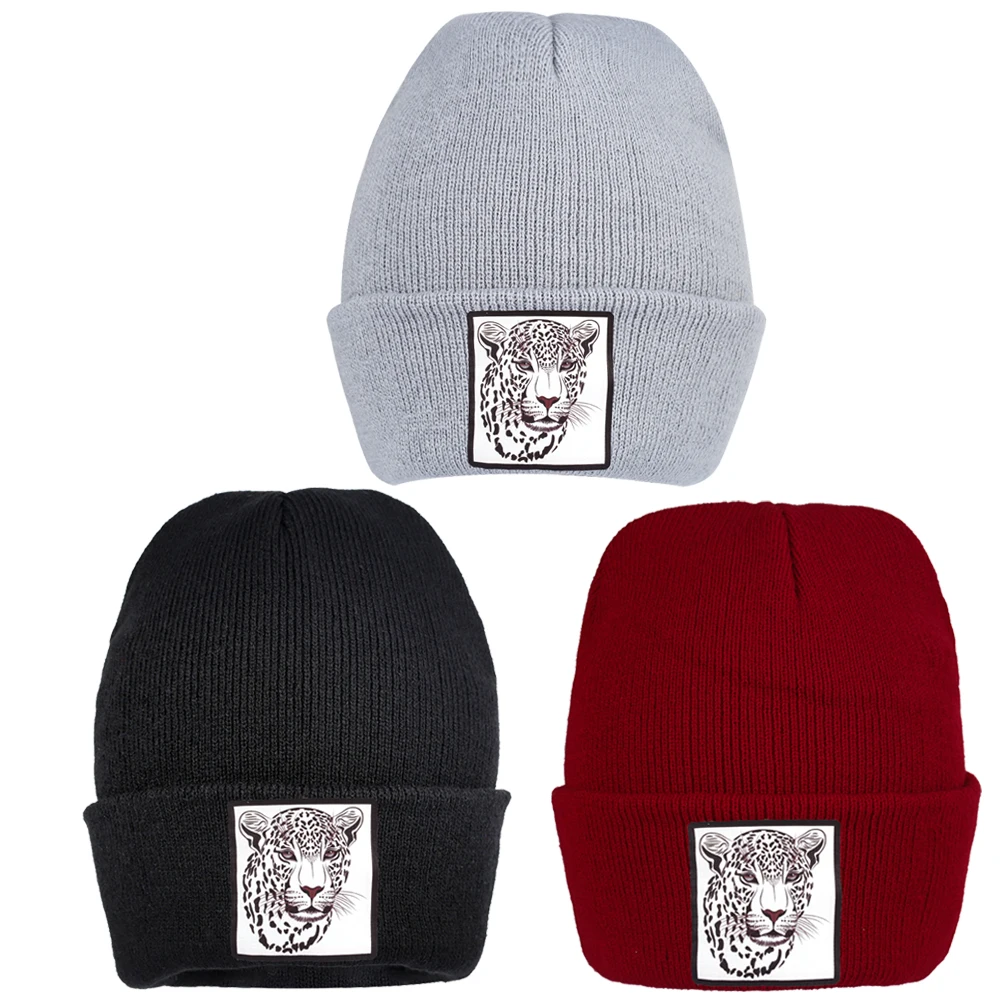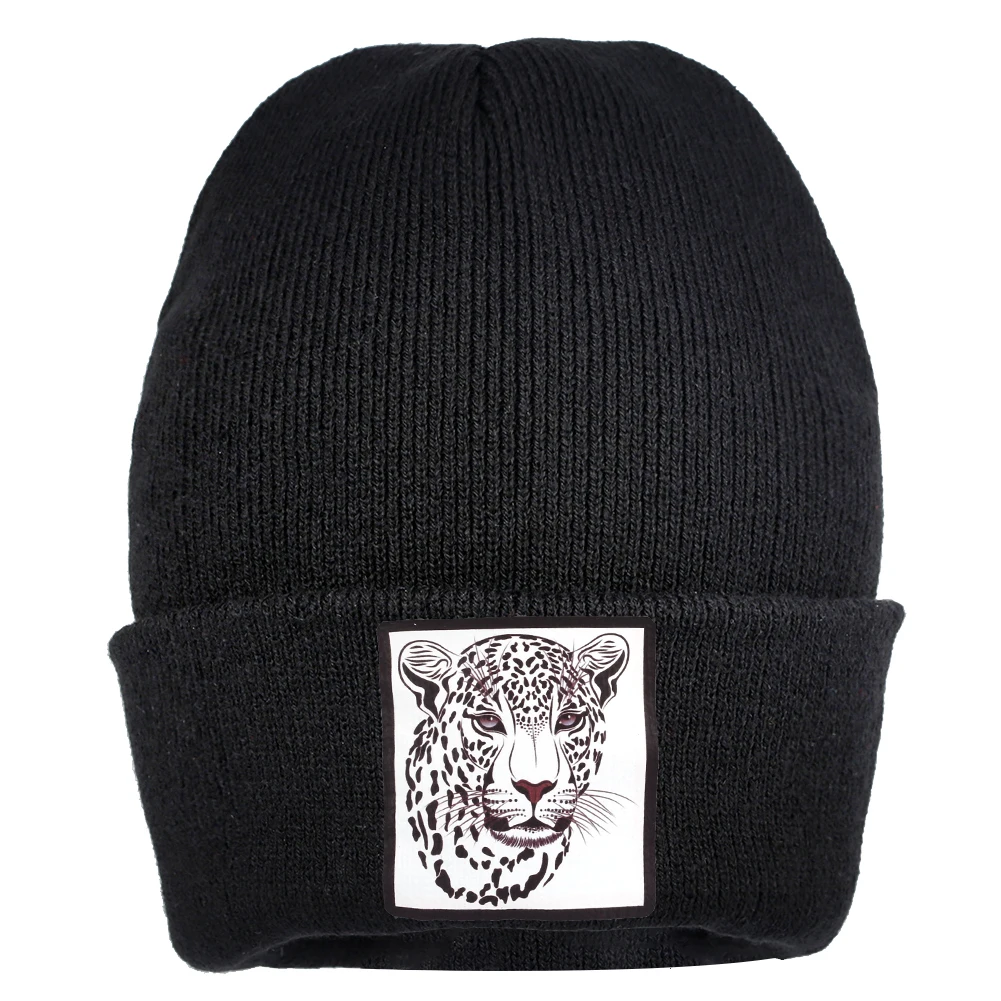 Черная шапка с леопардовым принтом и логотипом, зимняя шапка Skullies, мужские крутые шапки с помпоном, элегантные шапки в стиле хип-хоп