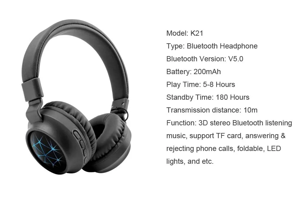 1. Поддержка TF карты воспроизведения, usic 2. Усовершенствованная технология Bluetooth 5,0 3. Большой 40 мм драйвер обеспечивает CD качество звука 4. Складная конструкция позволяет легко носить с собой во время путешествий 5. Регулируемые руки, чтобы соответствовать вашей голове 6. Встроенный микрофон поддерживает звонки без рук 7. Поставляется в комплекте с проводной (3,5 мм аудио кабель в комплекте) и Беспроводной соединение 8. Уникальный светодиодный светильник Добавляет модный фактор к наушникам