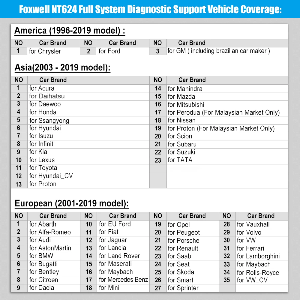 Foxwell NT624 Elite OBD OBD2 сканер покрытия автомобиля: