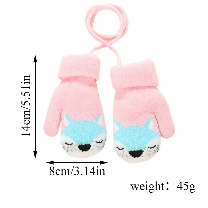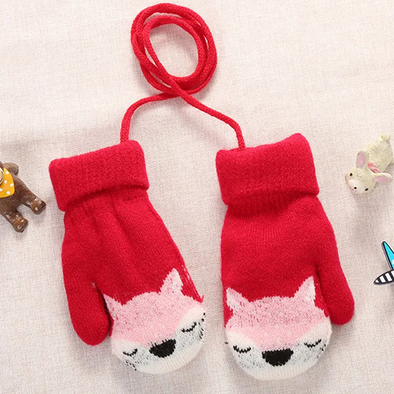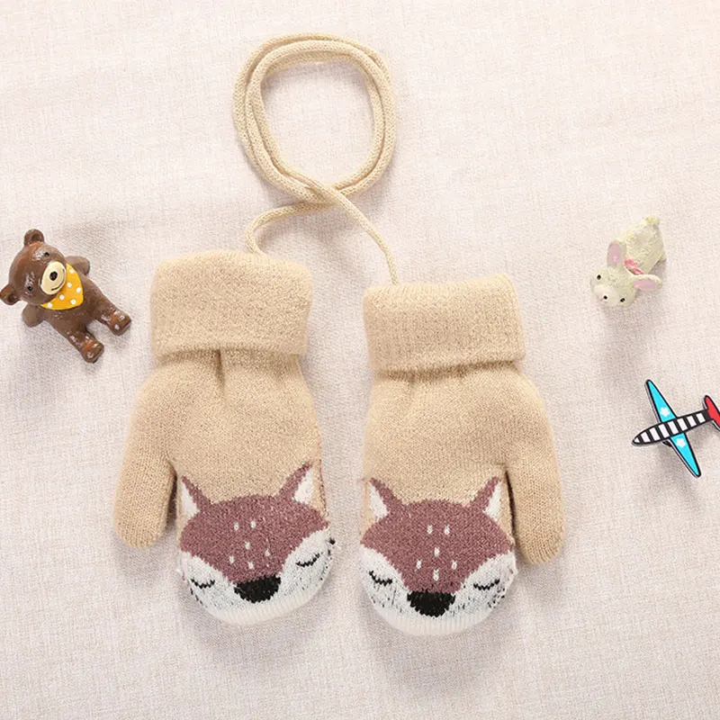 Детские перчатки с милой лисой, зимние теплые вязаные шерстяные уплотненные варежки с полным пальцем