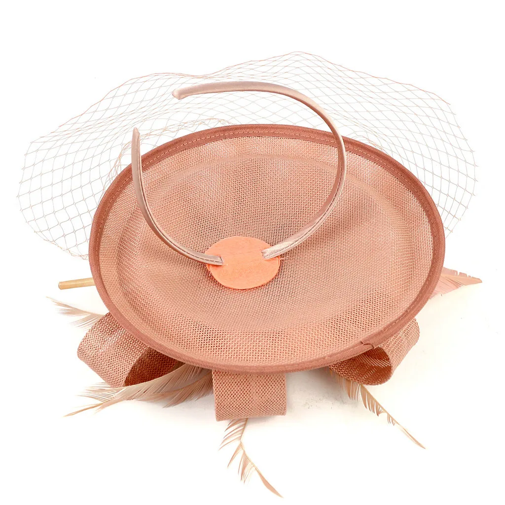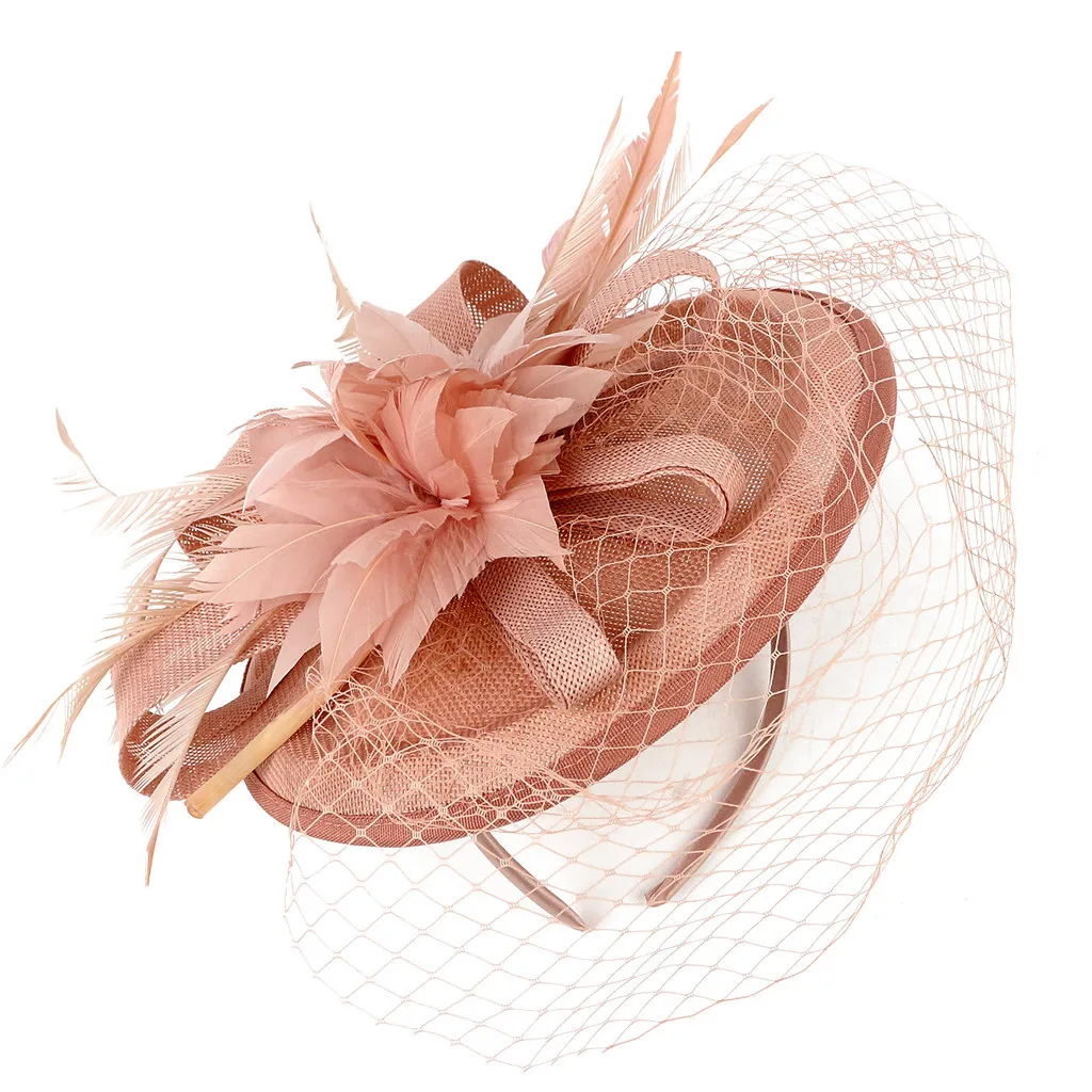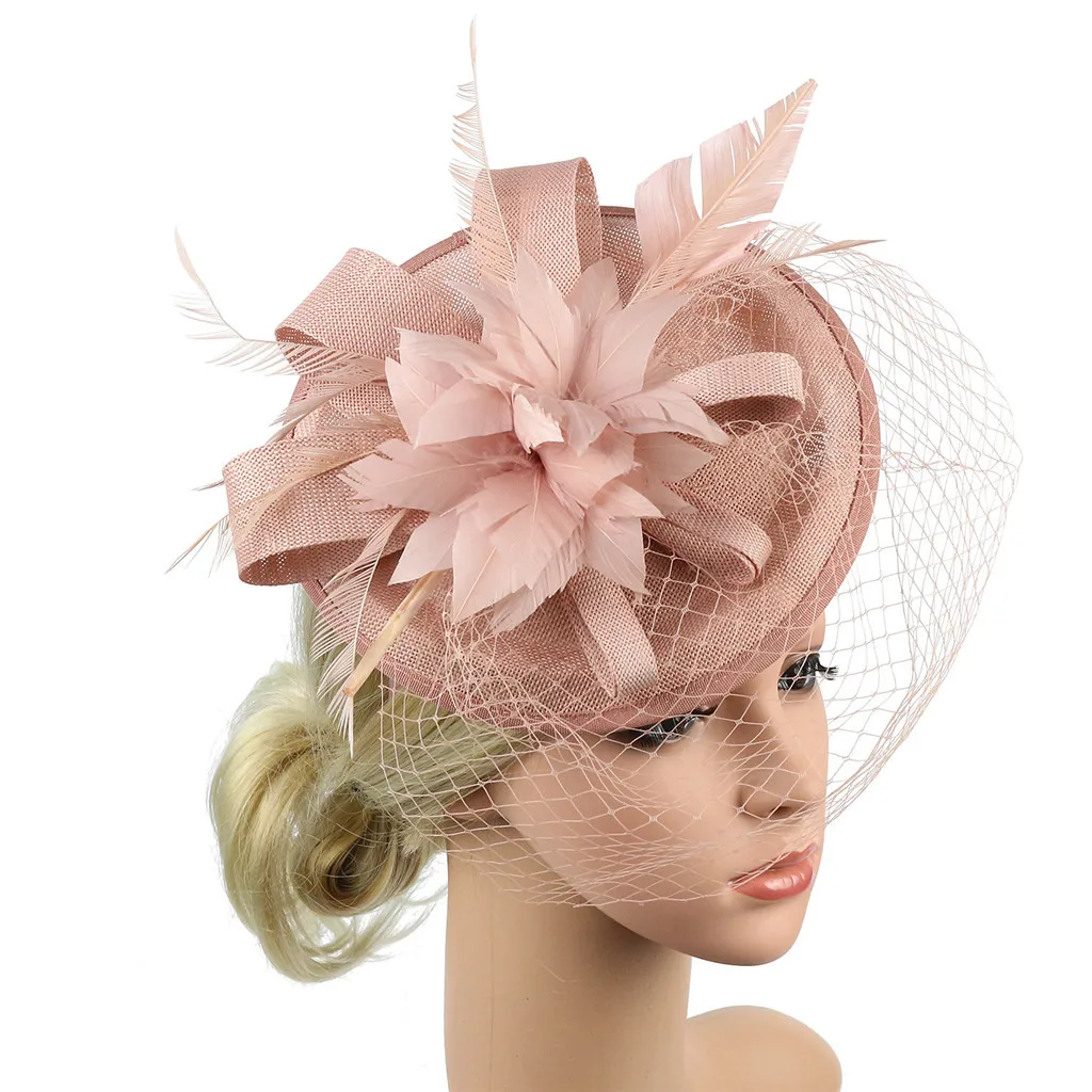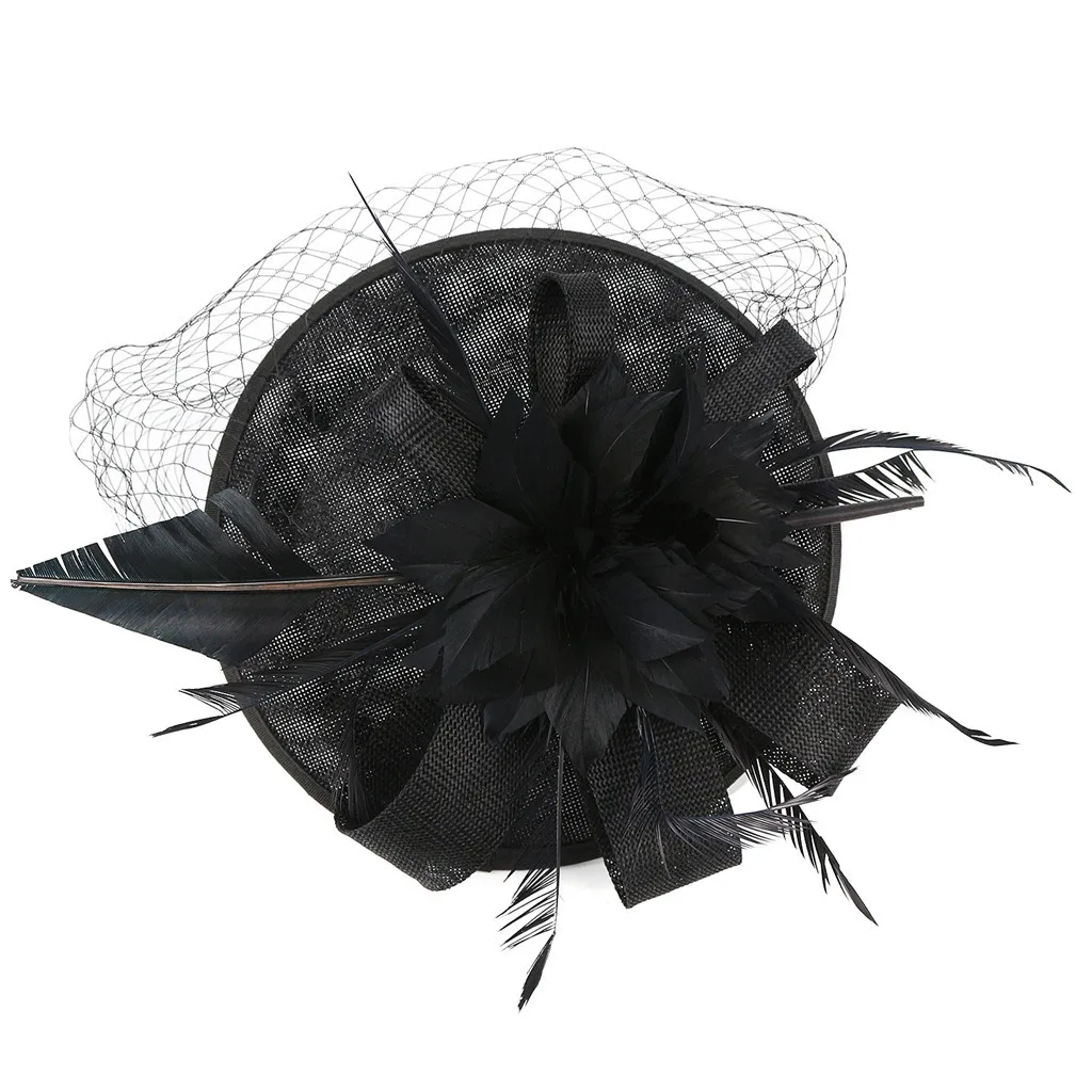 2. Деликатная ручная работа- Милая шляпка-Вуалетка, смешанные детали, включая перья, плетение и скульптурный дизайн цветка.