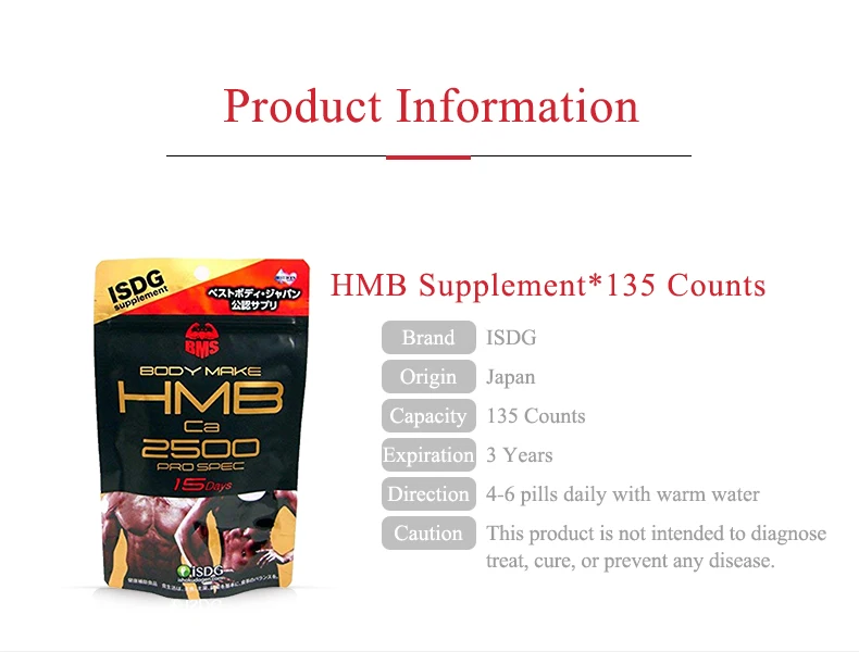 (Производство) Япония [Функциональность] Восстановление мышц, рост и удержание [Руководство] 4-6 таблеток каждый день с водой 【Capacity】 135 отсчетов (Срок годности) 3 года. (Состав) Витамин В-плюс: для поддержки иммунитета и улучшения состояния кожи HMB-Ca: восстановление мышц, рост и удержание (Кто может принимать) Взрослые, среднего возраста, пожилые, страдающие артритом, спортсмены. (Противопоказания) Если Вы беременны, кормите грудью или имеете какое-либо заболевание, пожалуйста, проконсультируйтесь с Вашим врачом, до того, как начнёте приём. Пейте больше воды во время курса приёма, так продукт усвоится лучше. Не употребляйте кофе или чай во время приёма продукта. 4. Пищевая добавка, эффект которой не может сравниться с лекарством, поэтому, как правило, для нашего тела требуется 1-2 месяца, чтобы поглотить добавку, а затем применить эффект.