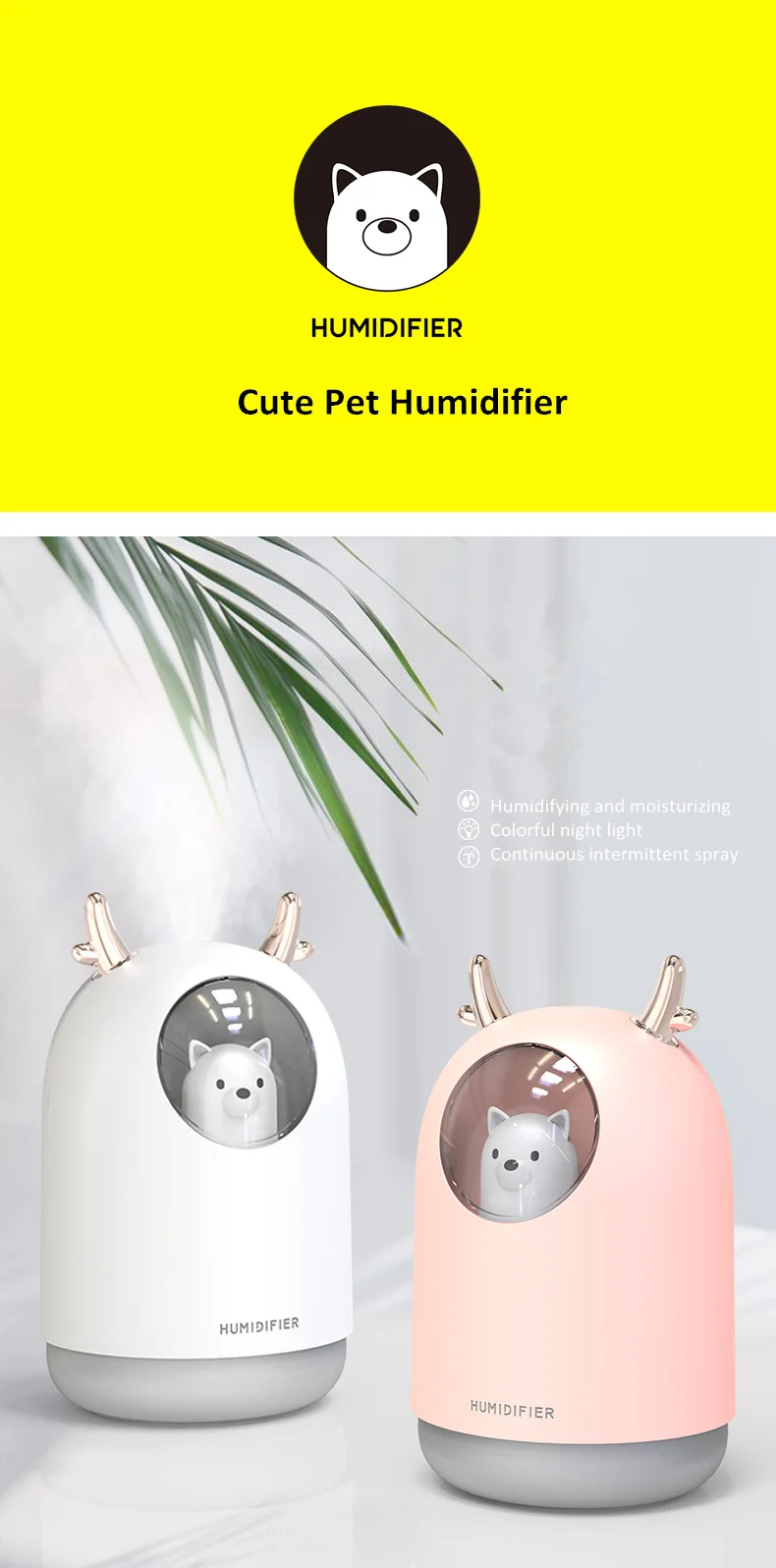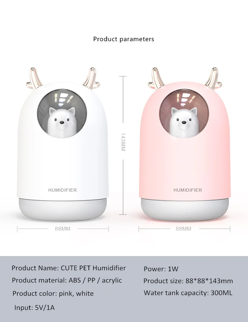 Название продукта: милый увлажнитель в форме домашних животных Материал изделия: АБС/ПП/акрил Размер изделия: 88*88*143 мм цвет изделия: розовый, белый Емкость резервуара для воды: 300 мл Вход: 5 В/1 А мощность: 1 Вт Ночной светильник и лампы: Цветной