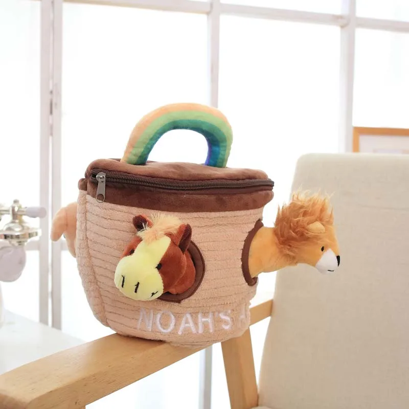 Включает в себя: 4 плюшевые игрушки животных (слон/лошадь/Лев/собака)