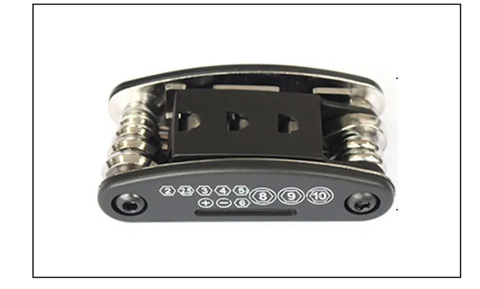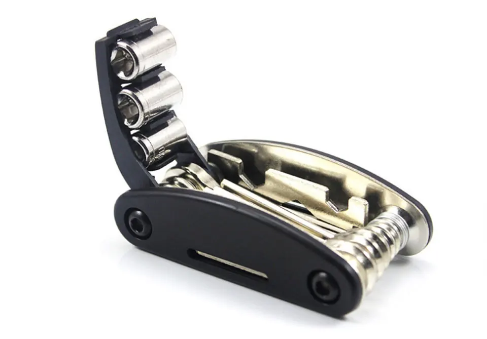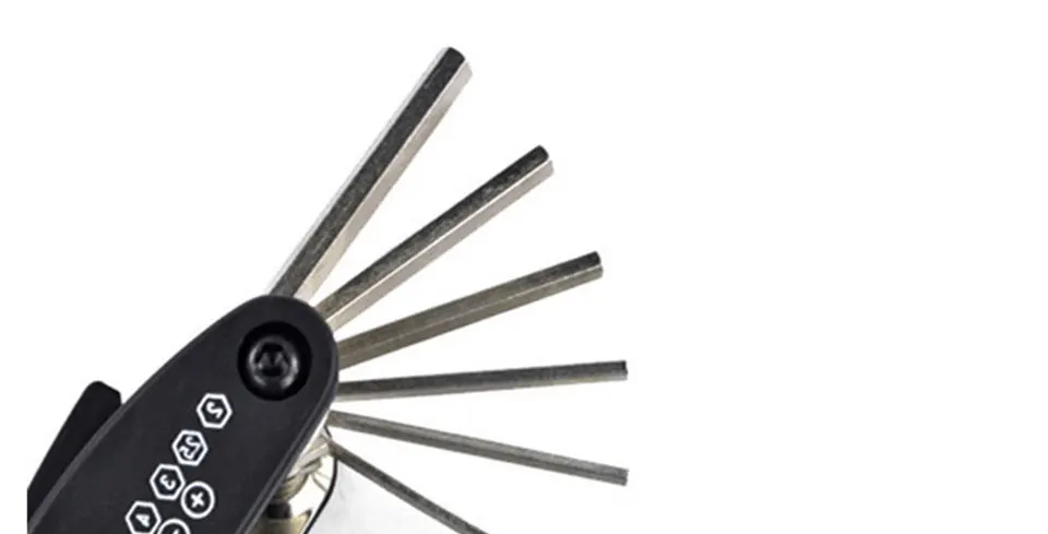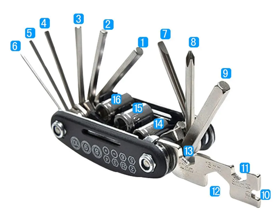 16-in-1 folding repair tool, Allen key 2/2.5/3/4/5/6mm, slotted screwdriver, Phillips screwdriver, sleeve extension post, spokes, hand wrench, 10/10/15mm