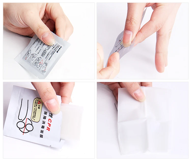 Product information Packing specification 26*9.5*7.5cm (50 pieces) box Product specifications 7*9.2cm (1 piece) package Validity: 3 years For artificial respiration, take a disinfection mask to prevent the secondary cross-feel of the bacteria, this product is a one-time use. Instructions for use Place the respiratory film on the patient's face, align the middle ventilation isolation opening (or check valve) with the mouth of the patient, and then use the mouth-to-mouth artificial respiration method to rescue. If there is any broken packaging, please do not use it! Mask placement Spread the mask on the patient's face as shown. Do not use if it breaks.