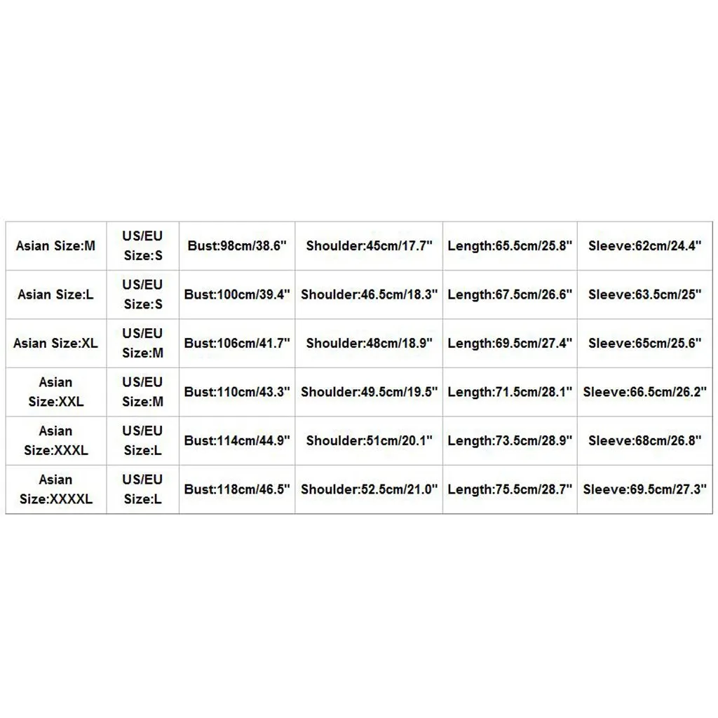 Азиатский размер Размер США/ЕС Бюст Плечо Длина Рукав М S 98 см/38,6" 45 см/17,7" 65,5 см/25,8" 62 см/24,4" L S 100 см/39,4" 46,5 см/18,3" 67,5 см/26,6" 63,5 см/25" XL М 106 см/41,7" 48 см/18,9" 69,5 см/27,4" 65 см/25,6" XXL М 110 см/43,3" 49,5 см/19,5" 71,5 см/28,1" 66,5 см/26,2" XХХL L 114 см/44,9" 51 см/20,1" 73,5 см/28,9" 68 см/26,8" XXXXL L 118 см/46,5" 52,5 см/21,0" 75,5 см/28,7" 69,5 см/27,3"