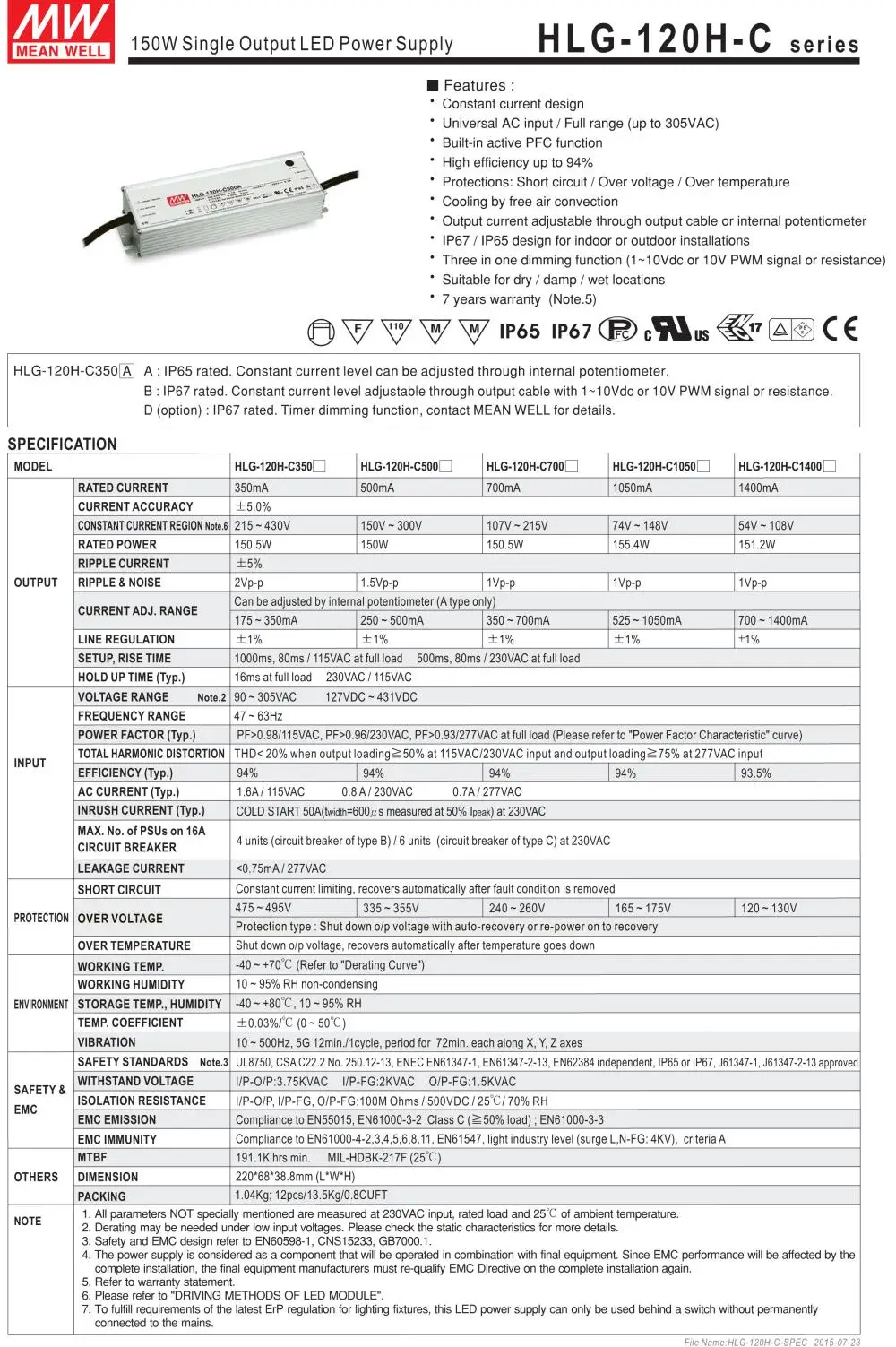 Meanwell 150 Вт Диммируемый Светодиодный источник питания HLG-120H-C1400B