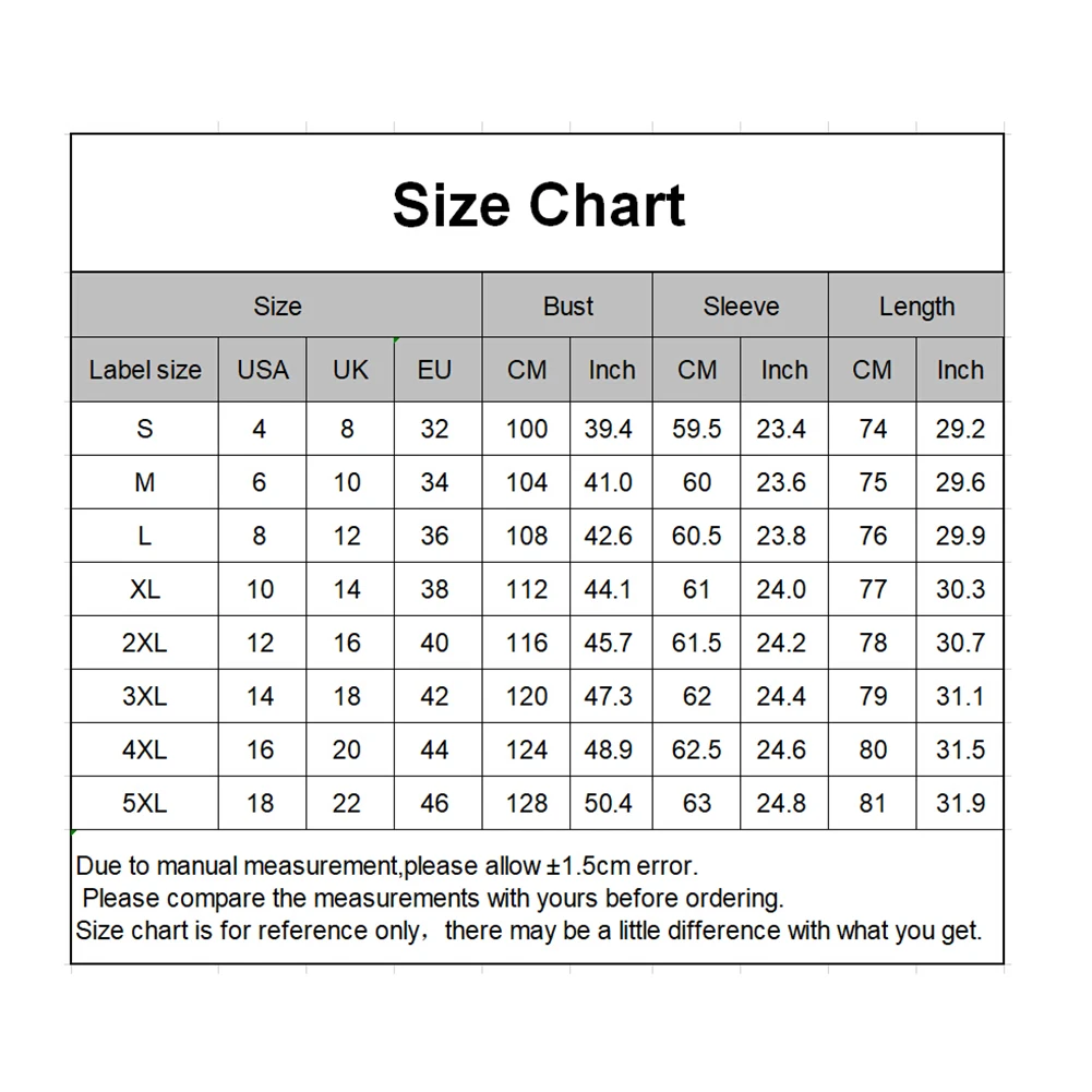 [Наш Размер 5XL] Обхват груди: 128 см/50,39 дюйма, длина: 81 см/31,89 дюйма, длина рукава: 63 см/24,80 дюйма (прибл.)
