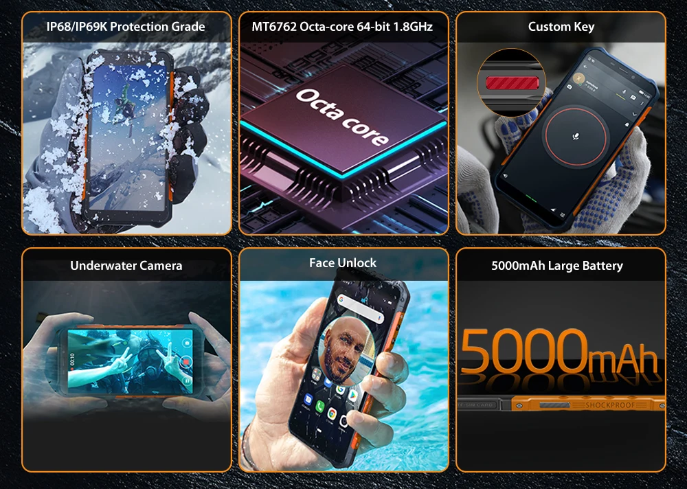 ULEFONEБроняX5(Водонепроницаемый смартфон IP68) ОС: Android 10 ЦП: MT6762 Тип:IP68 IP69K MIL-STD-810G