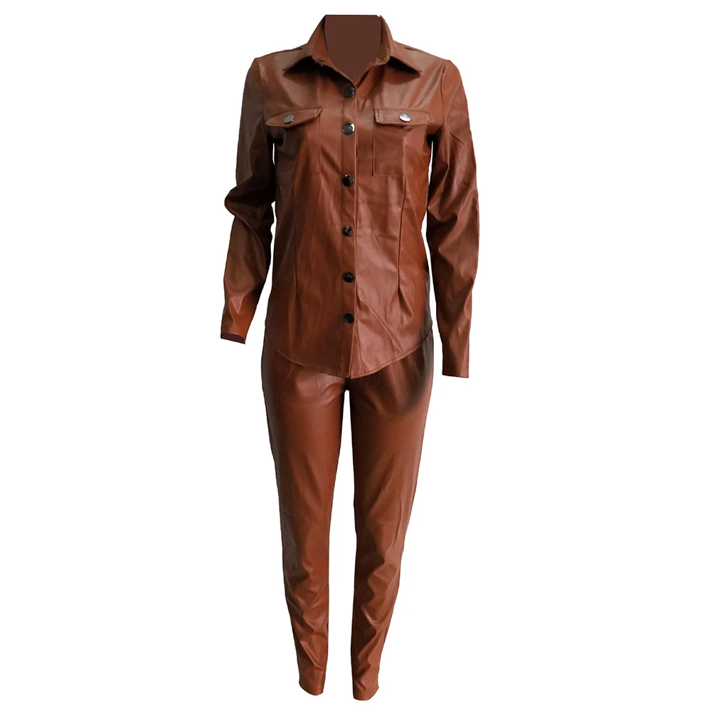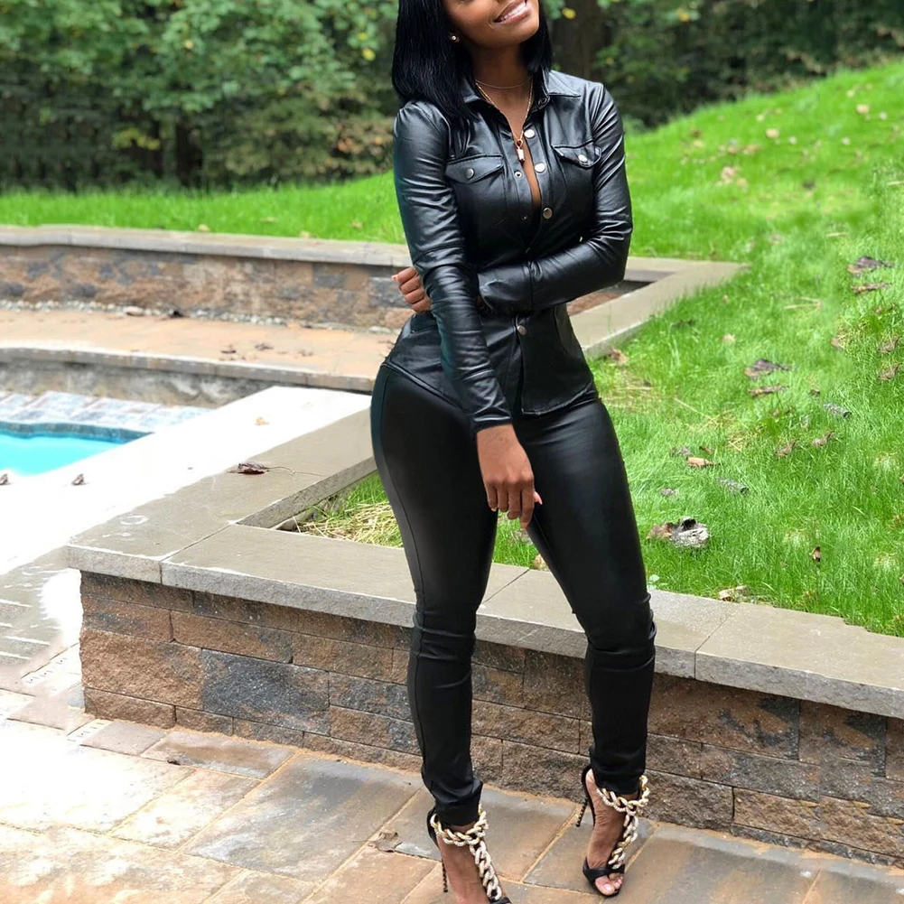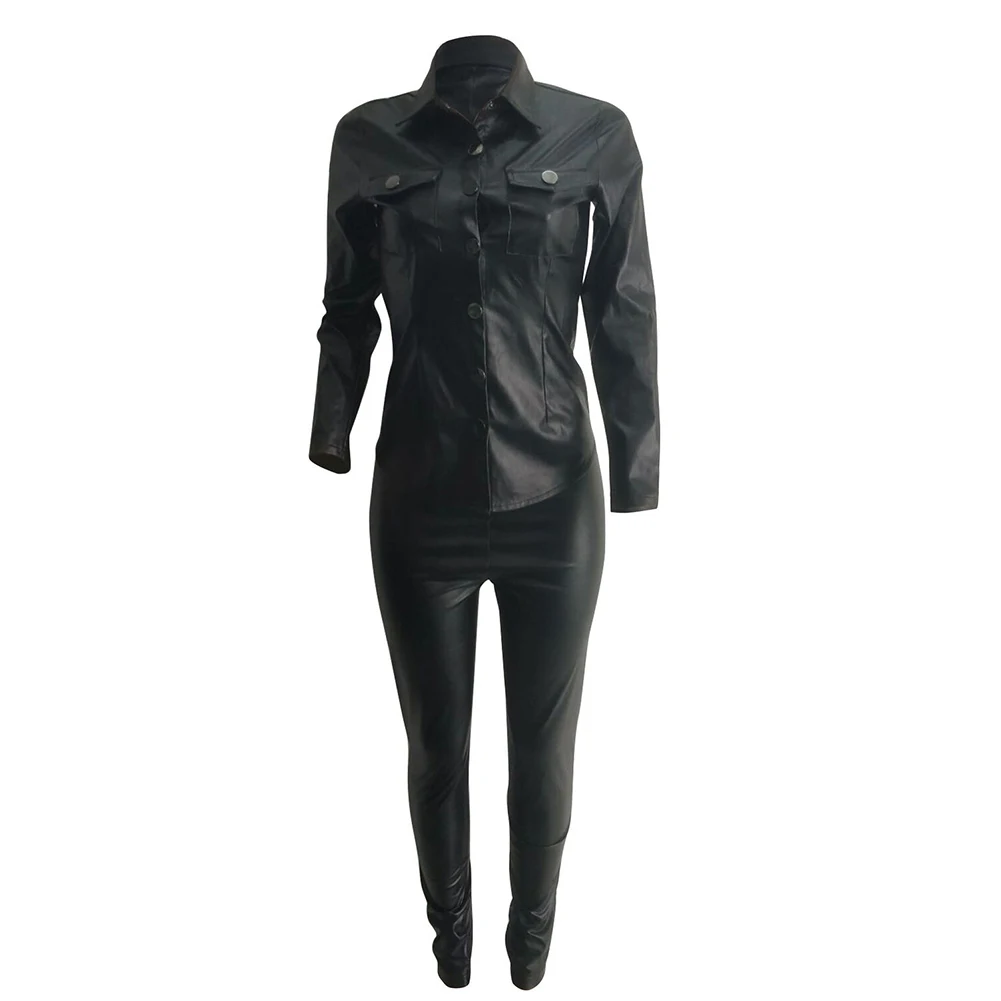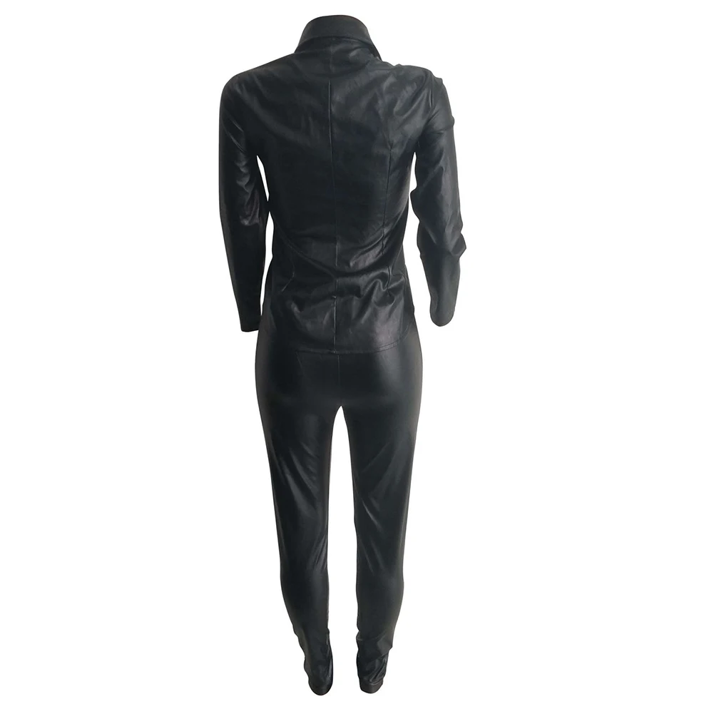 Женский Повседневный однотонный комплект из двух предметов из искусственной кожи с отложным воротником и брюк