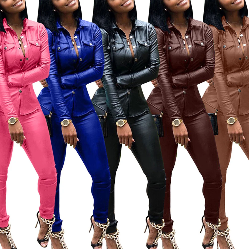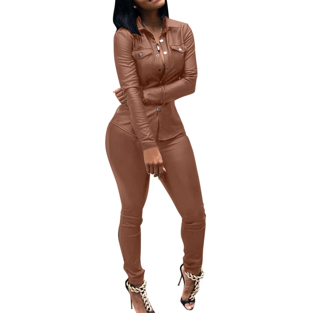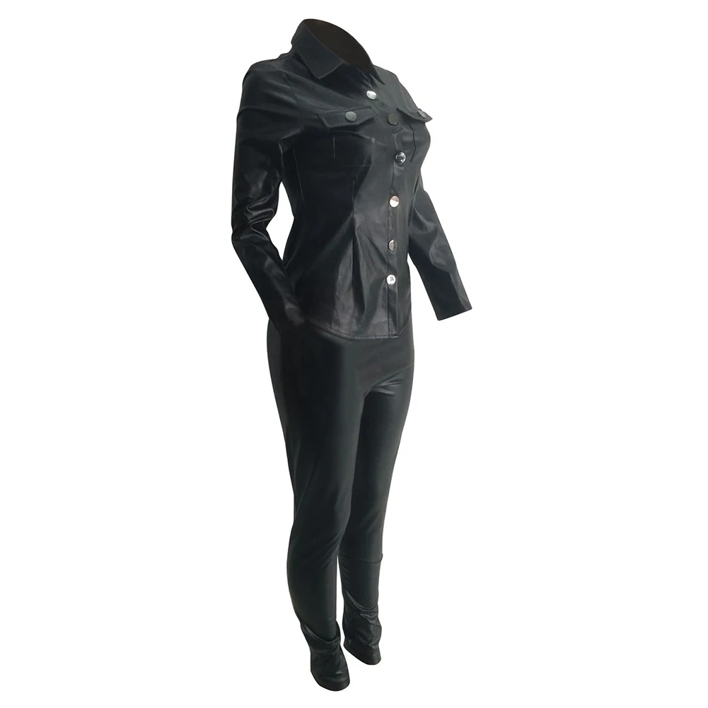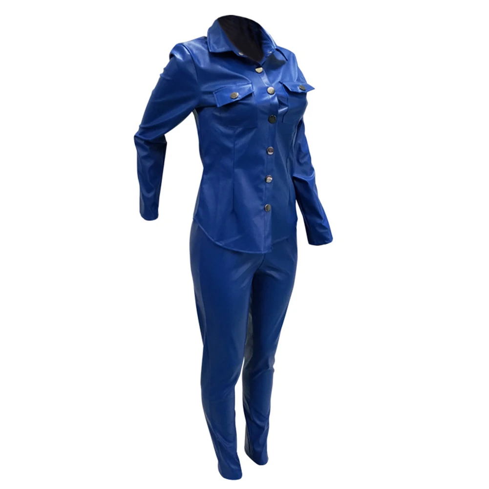 Женский Повседневный однотонный комплект из двух предметов из искусственной кожи с отложным воротником и брюк