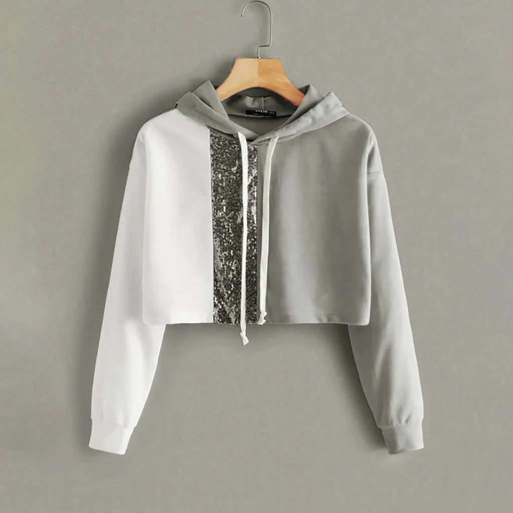 Расшитая блестками Лоскутная Толстовка с капюшоном, Женская цветная укороченная Толстовка с длинным рукавом, Короткая Толстовка с капюшоном, женские толстовки