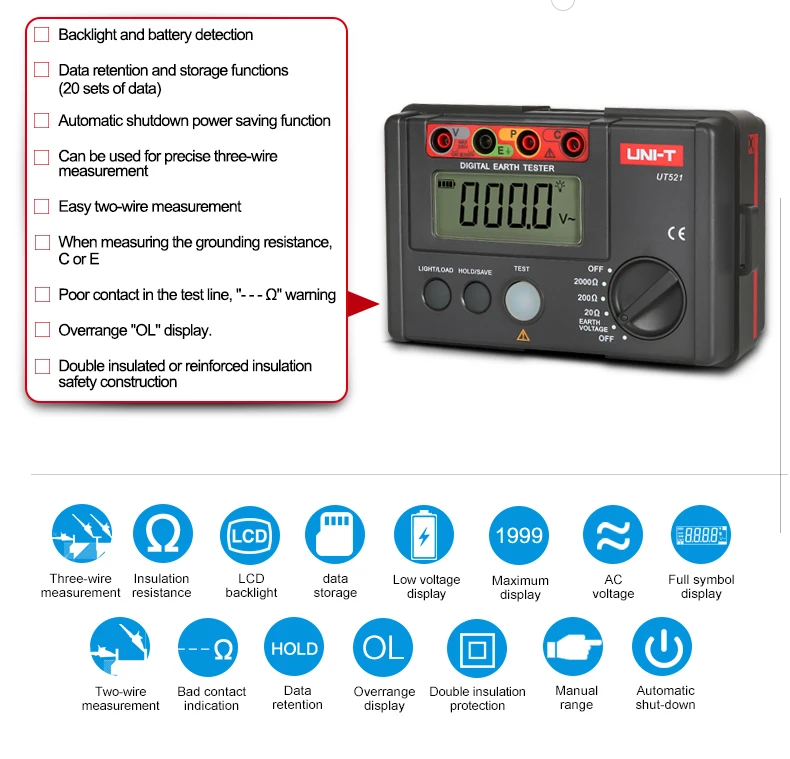 Display count:2000 Manual range Auto power off:Around 10 minutes Low battery indication Data hold Data storage LCD backlight Full icon display Double insulation protection Poor contact display:"...Ω" Over-range display:Display "OL" Simple 2-wire testing Precise 3-wire testing