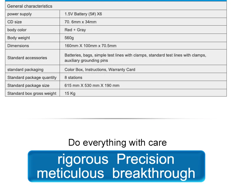 Display:70.6mm x 34mm Product size:160mm x 100mm x 70.5mm Standard accessories: simple test leads with alligator clips, standard test leads with alligator clips, earth spike, gallus